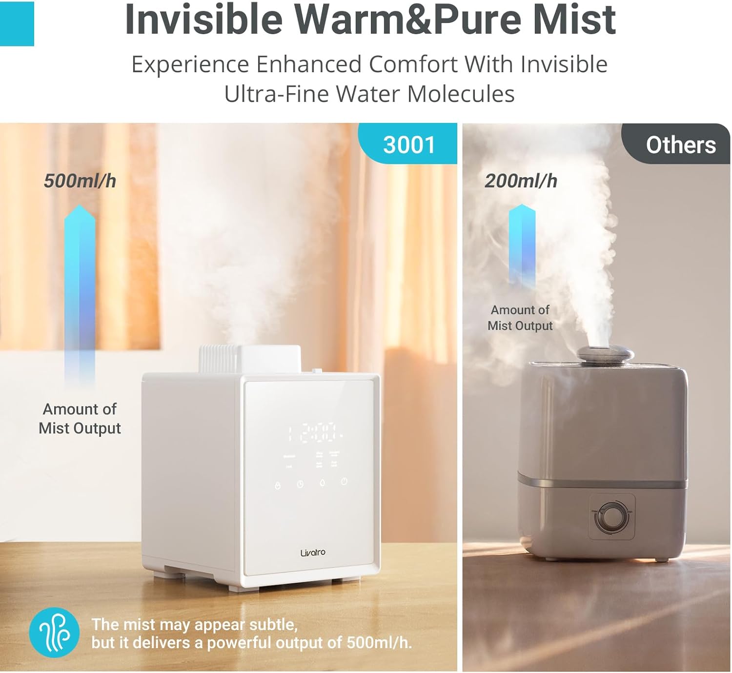 Pure and Clean Warm Mist: Compared to ultrasonic humidifiers, our stainless steel warm mist humidifiers heat water to a boiling point, producing healthy and pure steam that delivers soothing moisture. Ideal for alleviating dry skin, nasal congestion, and dry throat. (No filters required, easy operation and saving money)