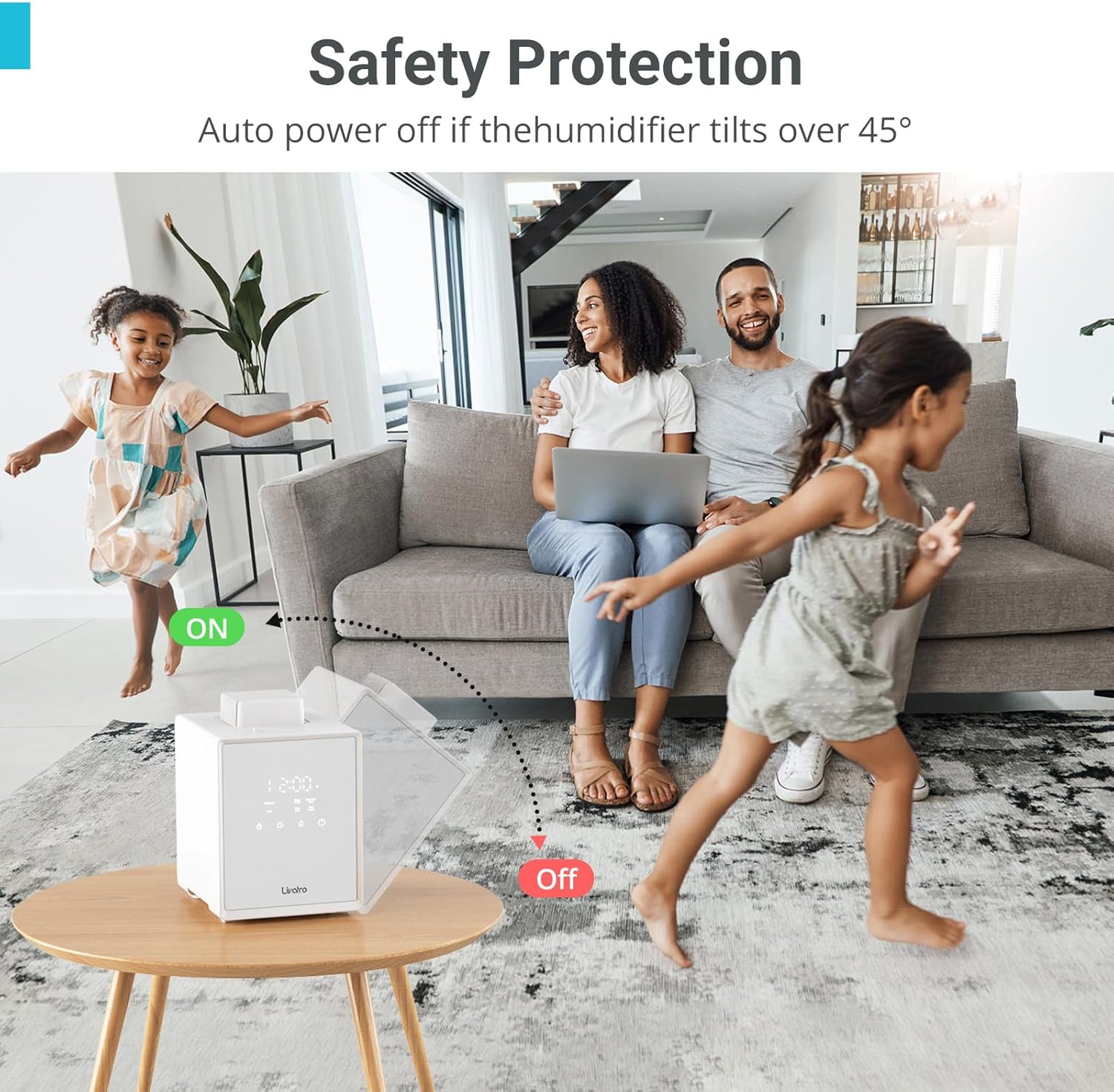 Comprehensive Safety Features: Designed with safety in mind, this humidifier features an auto-off function for low water levels, child lock, and a screen lock to prevent accidental touches, have 2m Long Power Cord. Try to keep out of reach of children.