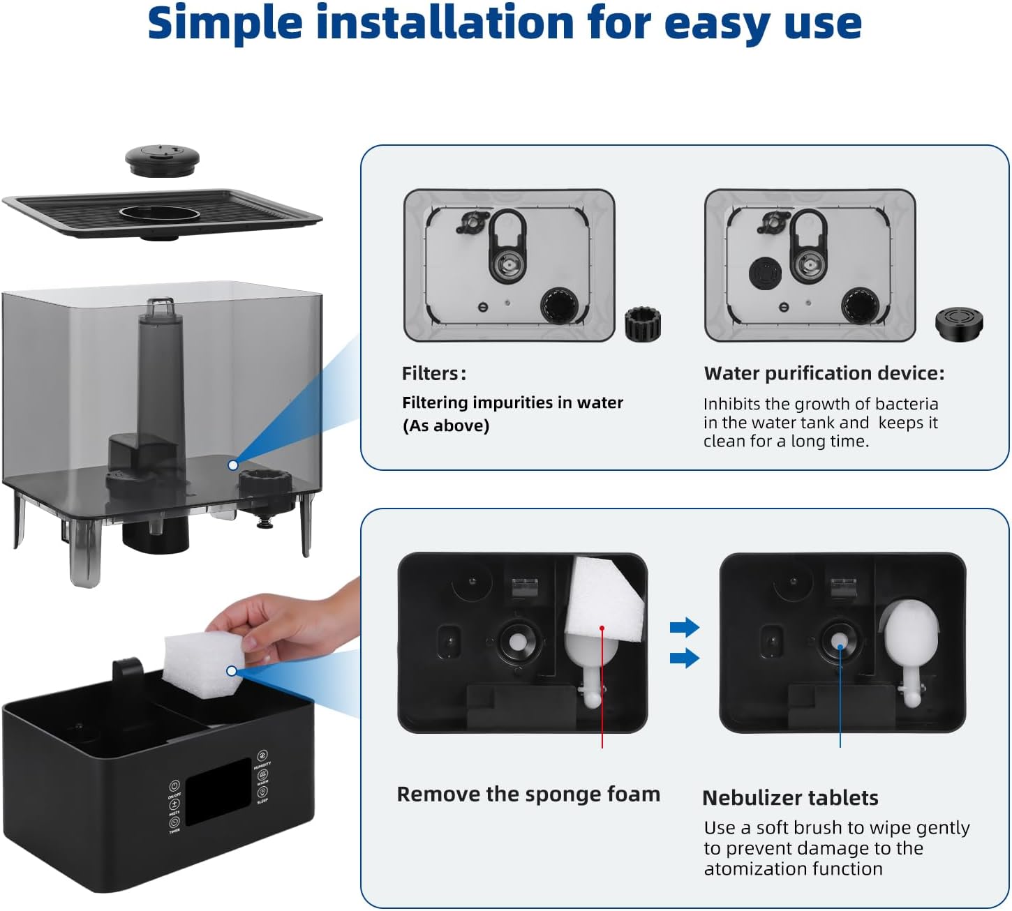 Diffuser & Humidifier 2 In 1 And Sleep Mode:With your favorite essential oils in the built-in aromatherapy tray, the top fill desk humidifier will fill your room with a relaxing aroma. Our humidifier has a quiet sleep mode that works at a low noise level to protect you from disturbing your good night’s sleep.This quiet humidifier features a top-fill design for convenience and simplicity. Its modular design is easy to remove and install for a hassle-free cleaning experience.