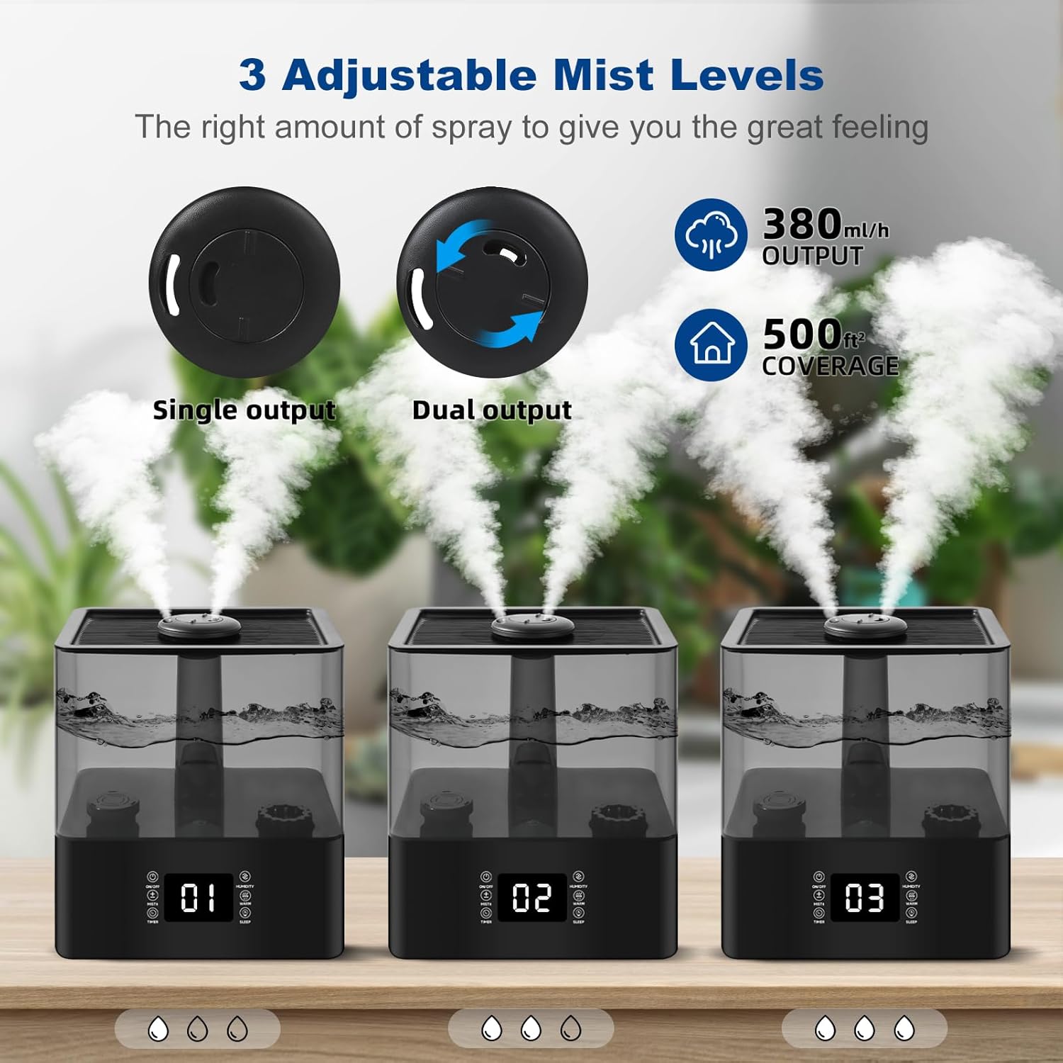 Smart Humidity Setting:Featuring a single and dual outlet design that produces up to 40 inches of extra-large water mist, our bedroom humidifier is designed with a smart humidity regulator that helps maintain pre-set humidity levels and allows you to view real-time humidity levels. Simply set your preferred humidity level to humidify your bedroom while providing faster relief from dry air, leaving you breathable and healthy.