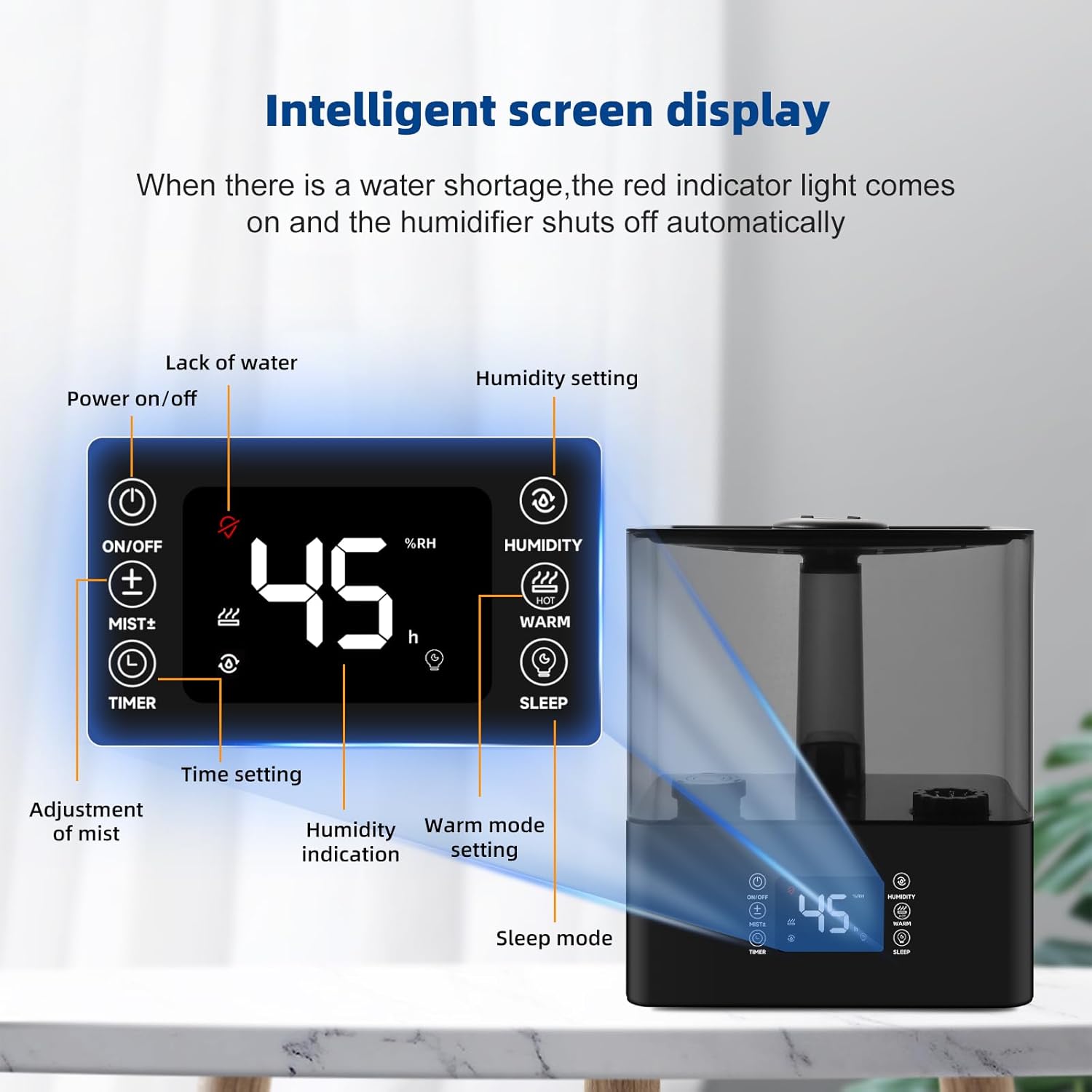 3 Levels Of Mist Adjustment And Timer:The Cool and Warm Mist Humidifier is available in three different spray levels and can be directed to your preferred spray with the 30° tilting nozzle. Screen display“- -”means that the humidifiers is always on and producing mist.The timer design gives you the freedom to choose when to humidify, making it the ideal humidifier for nurseries and plant care.