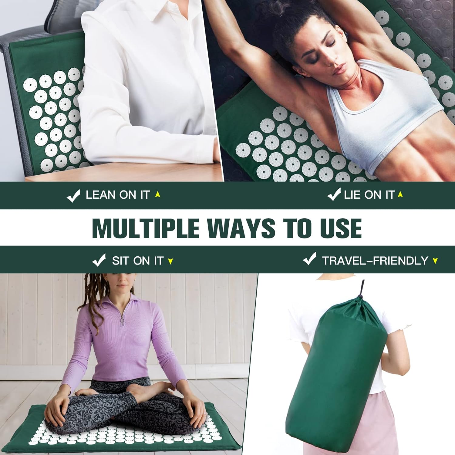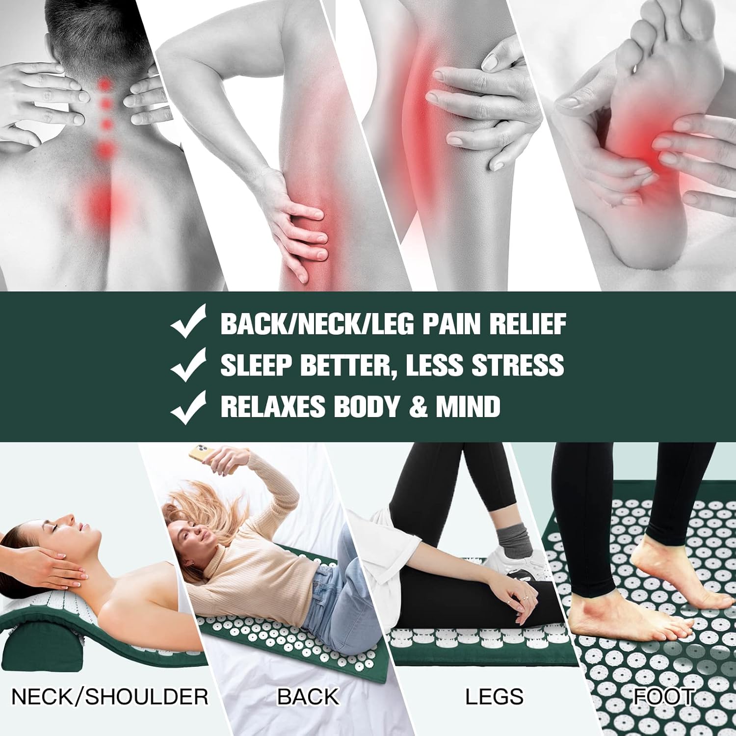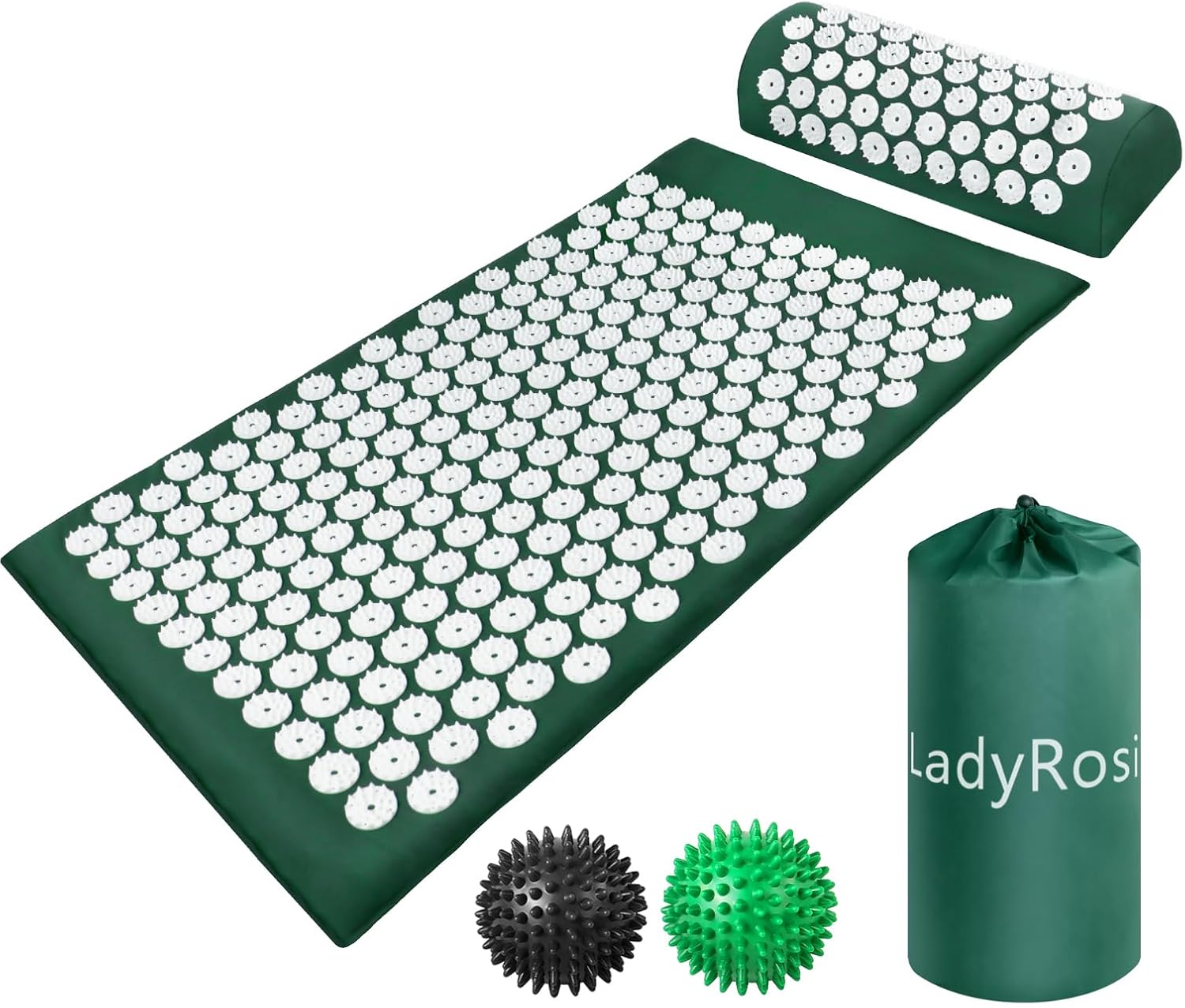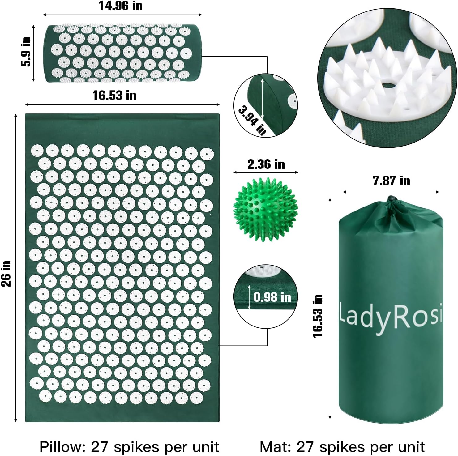 Material: cotton + ABS+ spongeSize of mat: 26.38″ x 16.53″ x 0.98″Size of pillow: 14.96″ x 5.9″ x3.94″Size of acupressure ball: 2.36″Folded size: 7.87″ x 16.14″Package included: 1 x acupressure mat, 1 x pillow, 2 x acupressure ball, 1 x carry bag