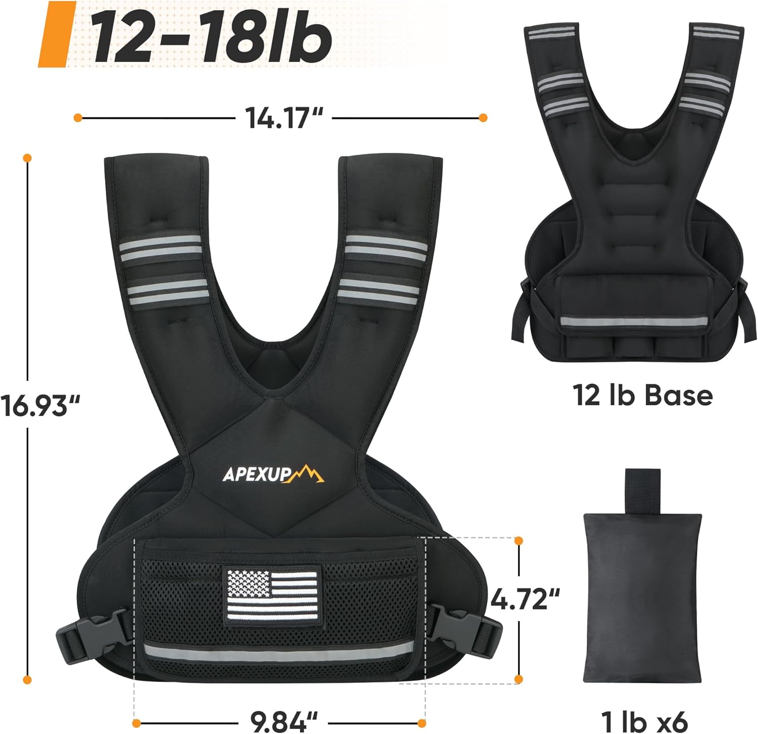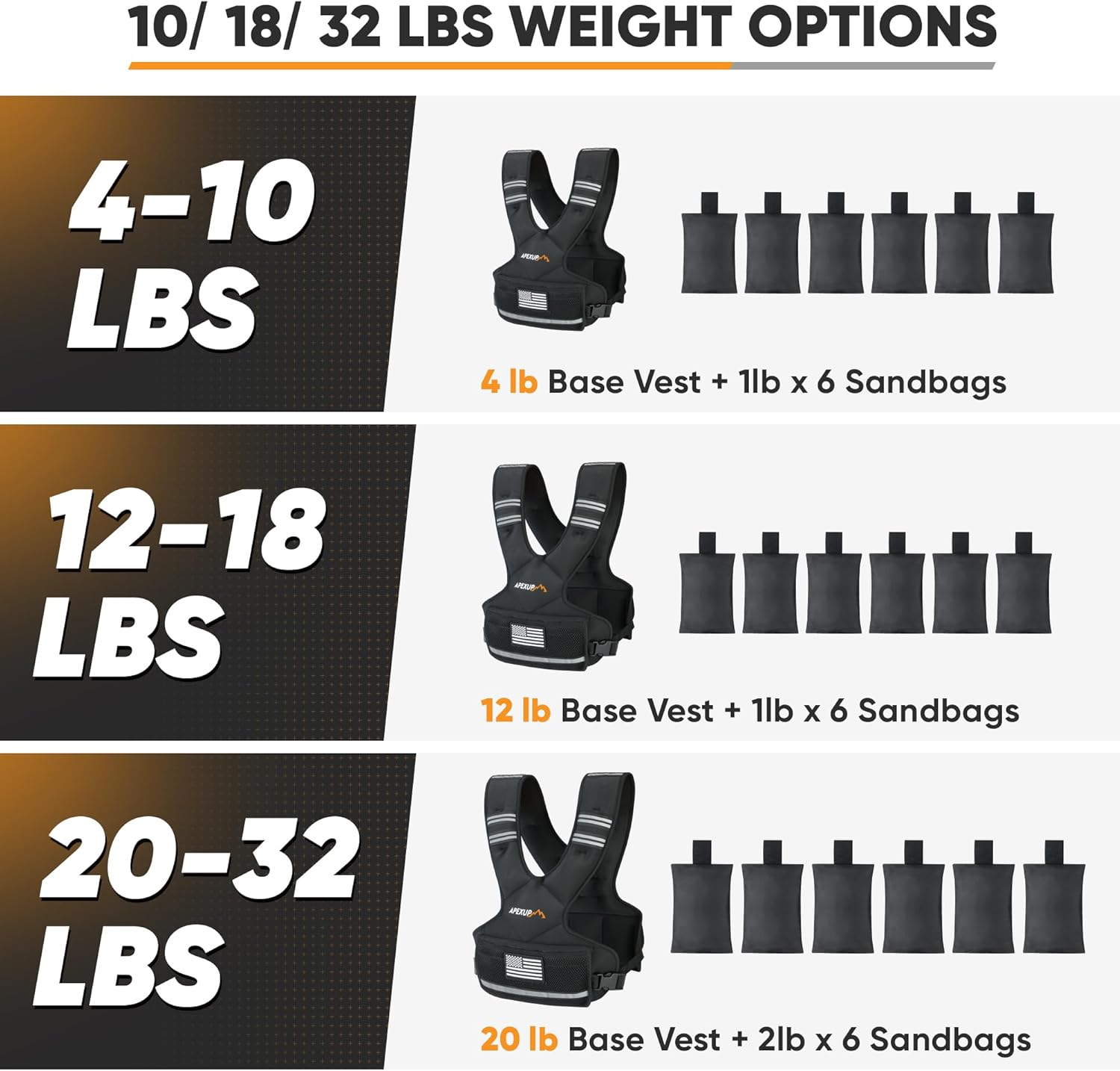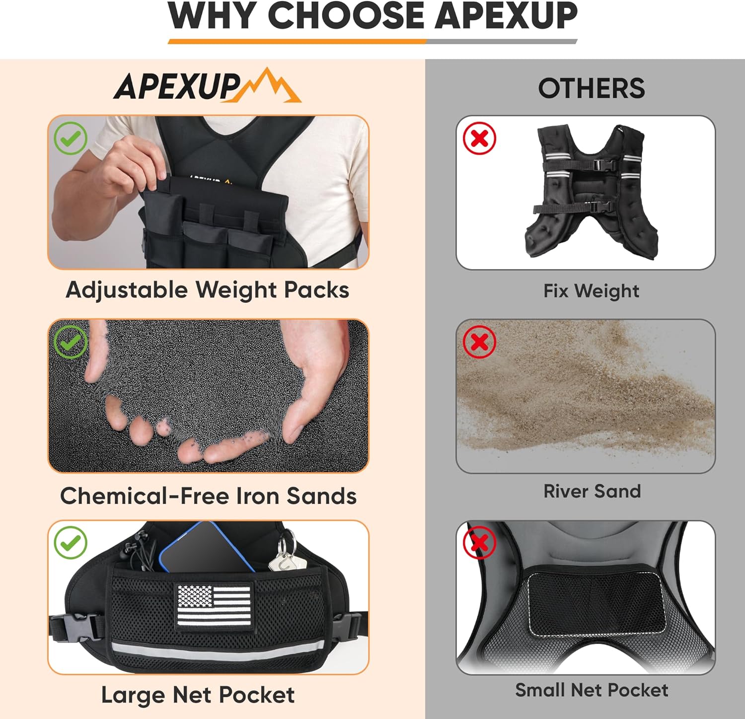 [ADJUSTABLE WEIGHTED VEST] APEXUP adjustable weighted vest has a base self-weight and comes with 6 sandbags, allowing you to adjust the weight according to your needs and saving you the trouble of buying multiple vests. Choose from 3 weight ranges based on your training stage, 4-10 pounds, 12-18 pounds, and 20-32 pounds.