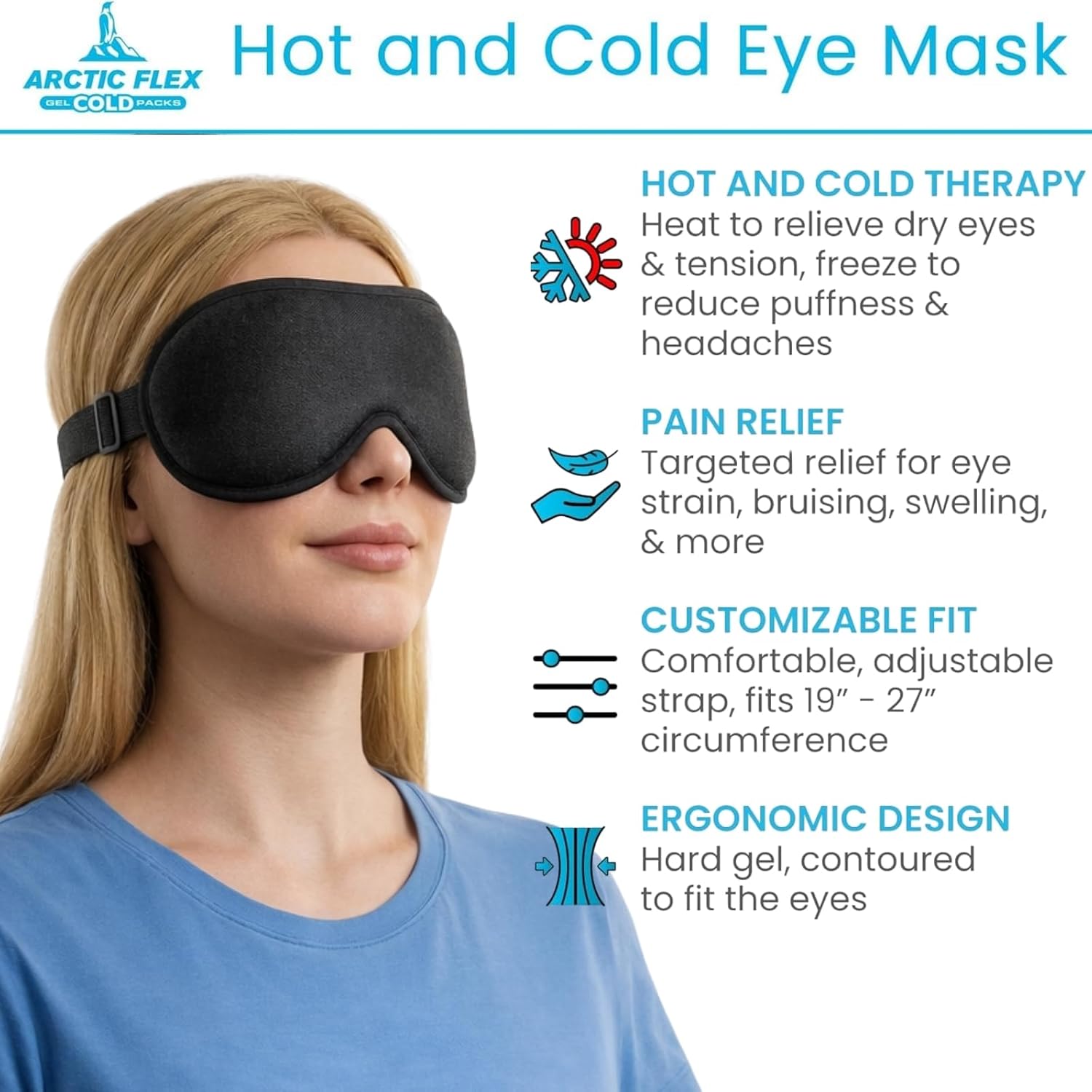 HOT AND COLD RELIEF: This eye mask provides soothing temperature therapy with the ability to be used both hot and cold. You can chill the flexible gel pack to reduce puffiness, eye strain, and headaches, or warm it to relieve dry eyes and sinus pressure. It is ideal for managing inflammation and fatigue-related discomfort.