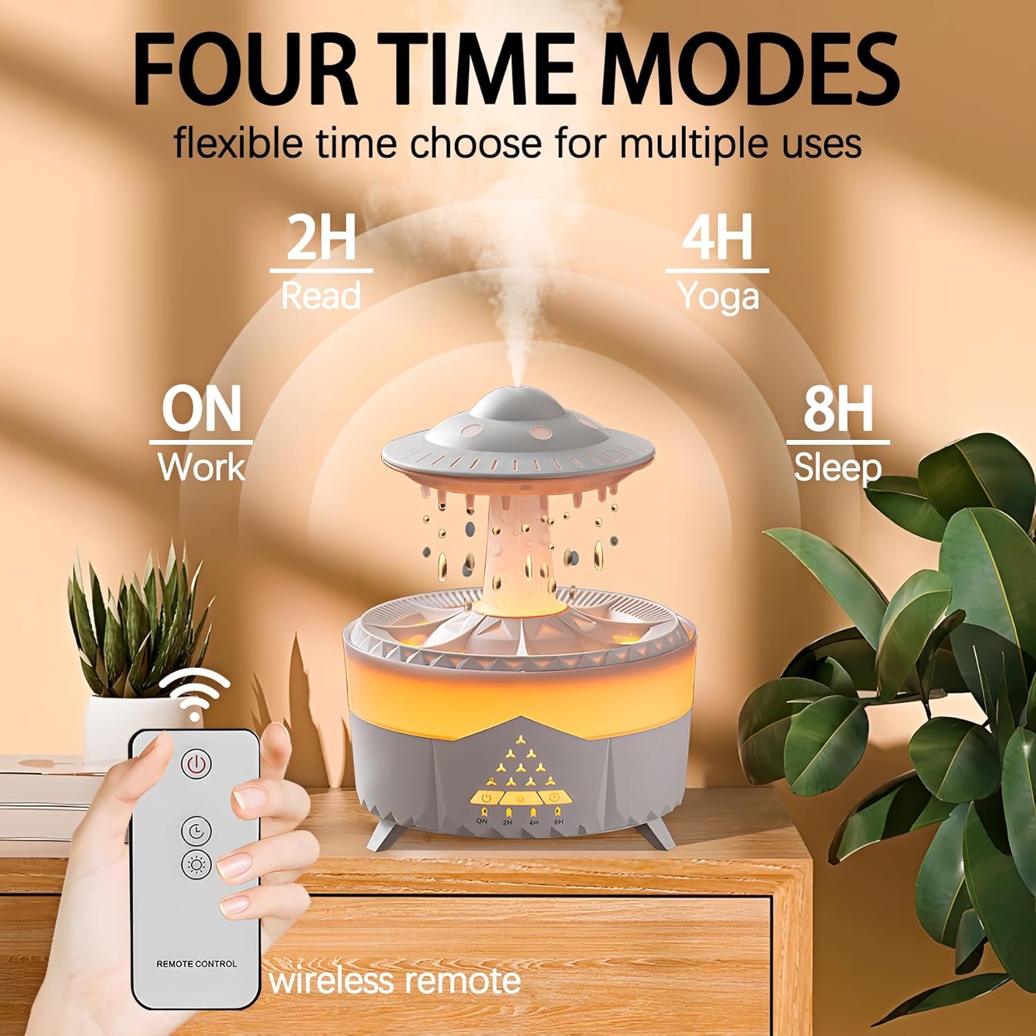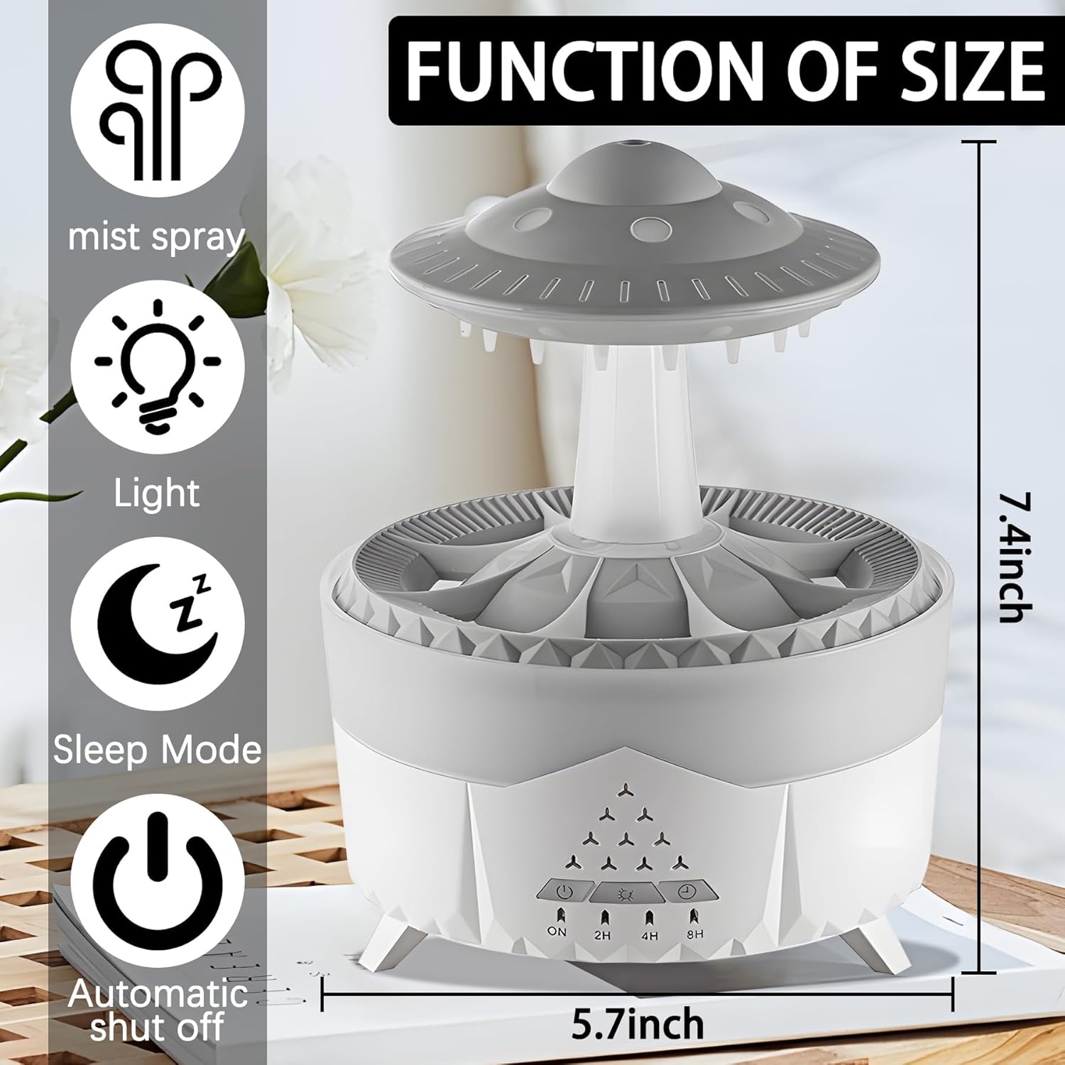 Timer shutdown : No water automatic power-off protection. This cloud humidifier with rain simulator function can make realistic and soothing rain sounds. With sound of raindrops, it is effective to release fatigue after a long day work and get relaxing. Perfect for home use, enable to feel calming and relaxing. Size: 180×120×198mm/7.0×4.7×7.7inch