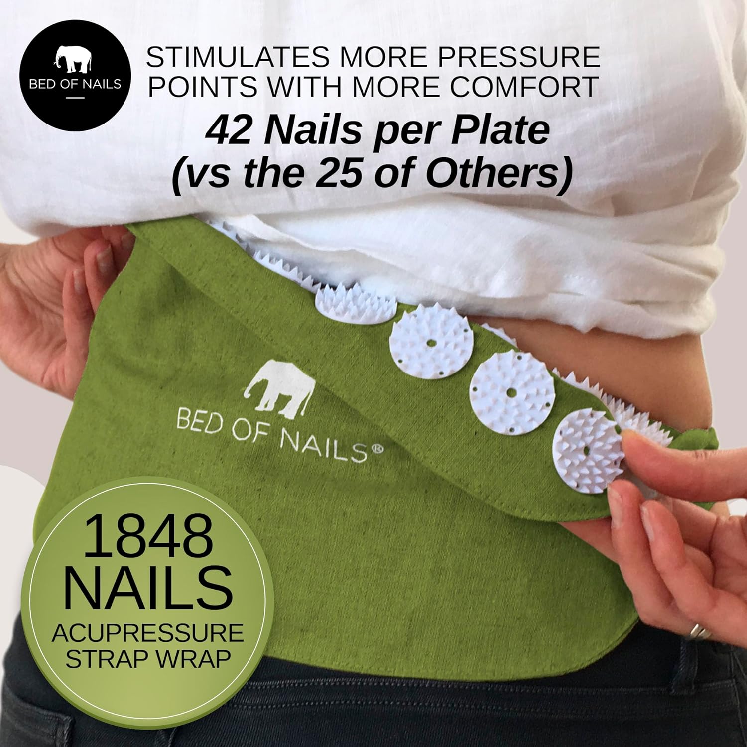 WHY MORE NAILS MATTER Our BED OF NAILS premium 1,848 nails acupressure strap uses 42 non-toxic nails on each plate rather than 25 like most other brands, stimulating more points with less intensity, for an invigorating rather than painful experience.
