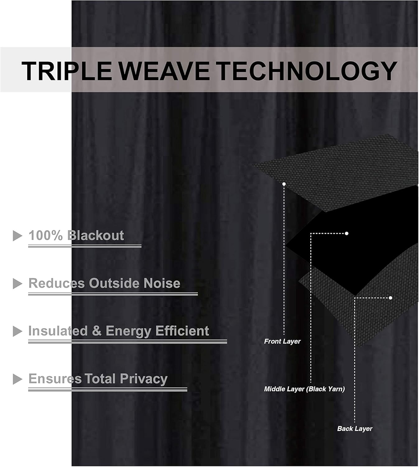 100% blackout curtain blocks out sunlight and harmful UV rays, reduces outside noise, and ensures total privacy. Creates energy-saving insulating barrier against heat and cold, keeping room cooler in the summer and warmer in the winter