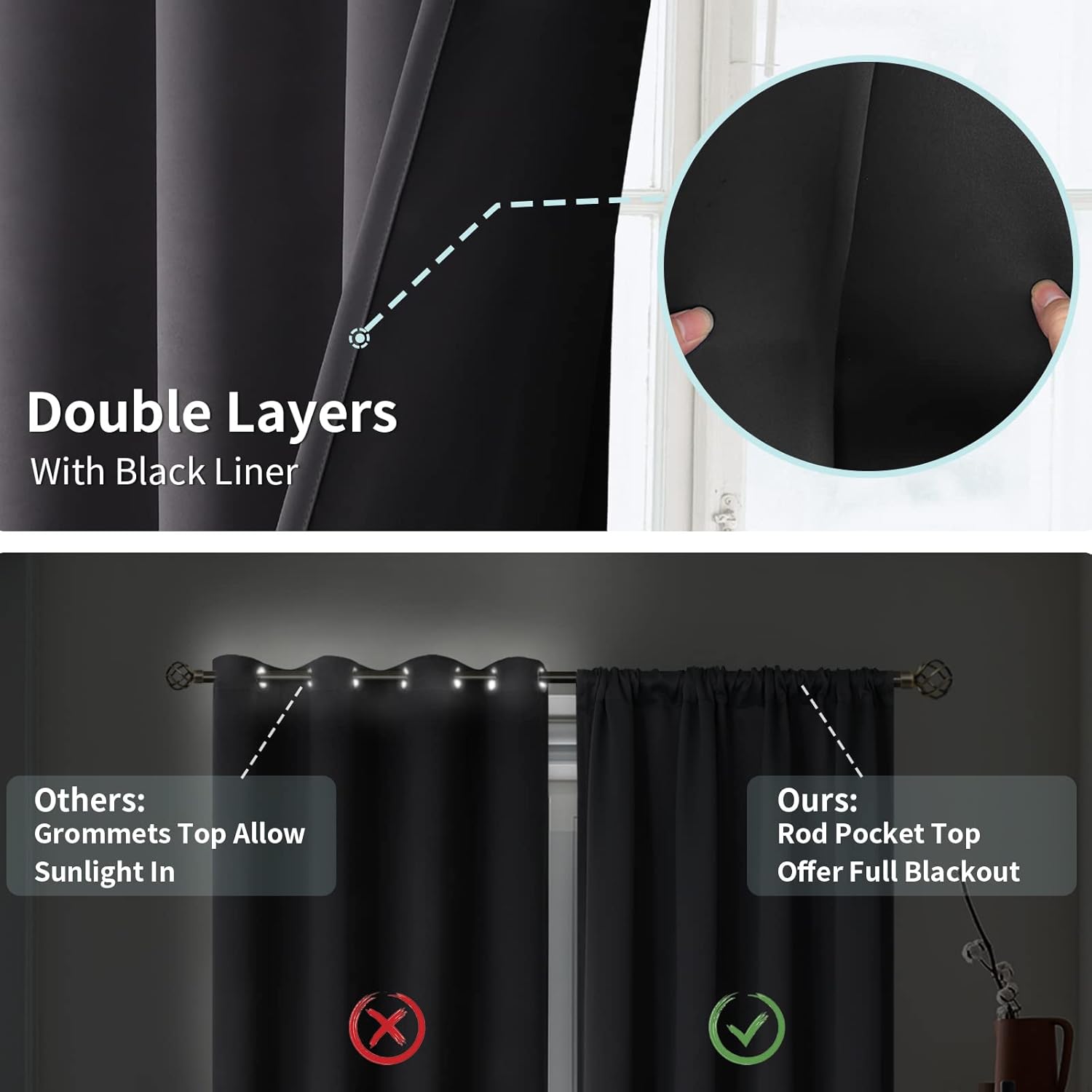 100% Blackout Curtains:These high-quality curtains are combined with black backing to make completely black-out curtains that help ward off streetlights and light, creating dark bedrooms and living rooms environment , while also providing better privacy.
