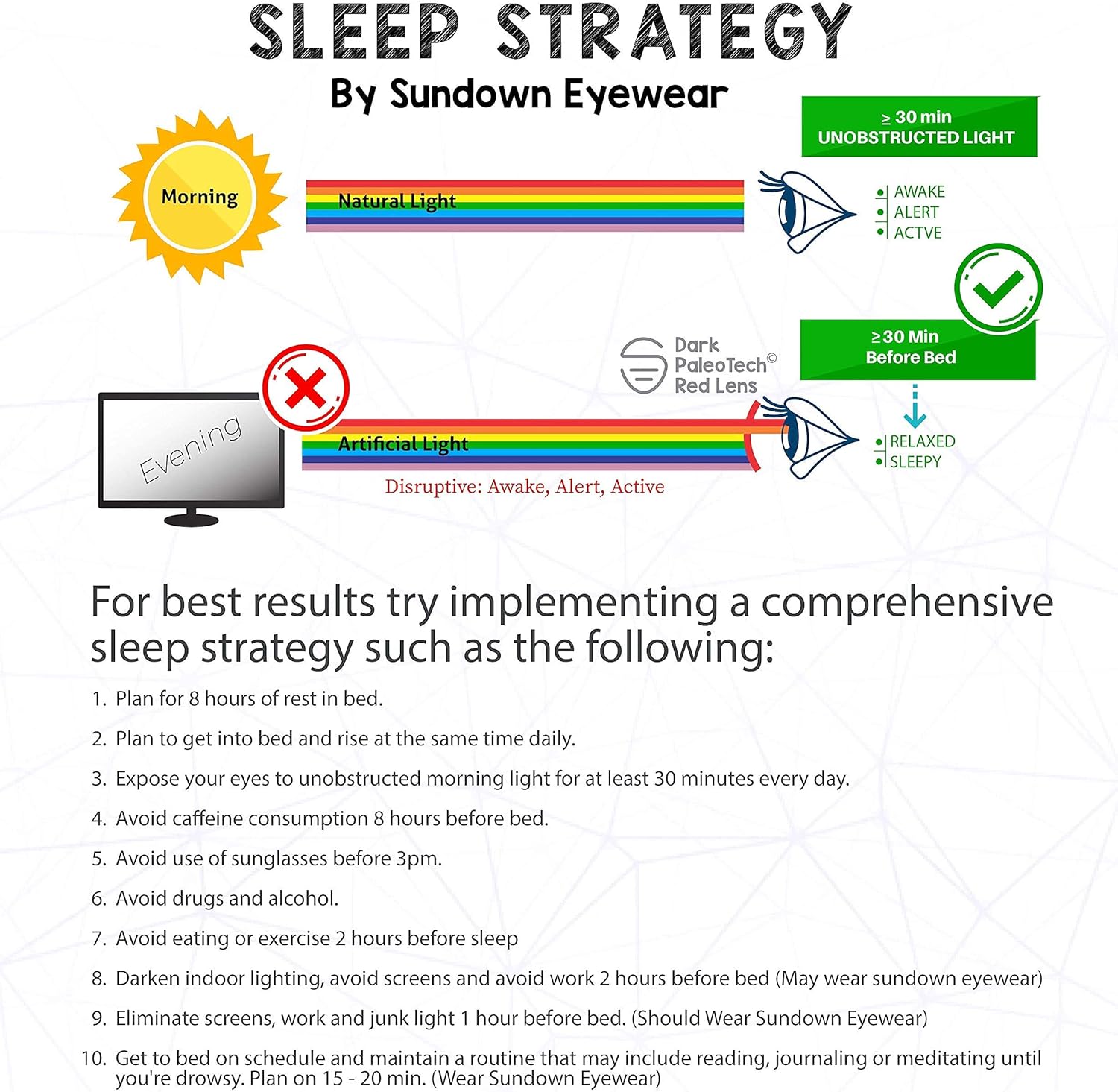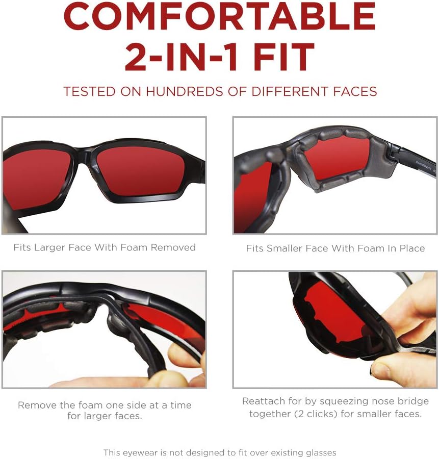 How they work: Wearing Sundown Eyewear with PaleoTech red lenses in the evening reduces the negative effects of artificial light exposure. It does this by mimicking natural light exposure that, as the evening darkens, signals our brain to prepare for rest. Why they work: Circadian rhythms (daily hormone changes related to light) govern much of our most basic biology. Re-synchronizing our hormone system results in not just a better sleep, but better brain function, better athletic performance and better metabolic function. The second way these eyewear function is by significantly reducing the light received by your eyes prior to bed. Our lenses block 92% of all the incoming light to function as ‘Dark Therapy’ eyewear that enhances melatonin response and sleep. Avoiding screens and artificial lights is the best practice but if artificial lights and screens are unavoidable, these eyewear are the next best thing. Sundown Eyewear block 99.8% of blue and green light under 580nm. That’s all the wavelengths of brain exciting, sleep disturbing light. Blue, green and bright light suppress the onset of the sleep hormone melatonin resulting in difficulty falling and staying asleep. Screens can be difficult to read as a result of blocking blue and green light. Use ’greyscale’ (black and white) screen setting for best function but avoid screens when possible since they’re not conducive to sleep. You may see some faint purple or violet, this is normal. Refer to our transmission values (<435 or >750nm) Our eyewear is designed to fit large faces with the foam removed (5′ wide at temple) and small faces with the foam attached (4.5″ wide at temple). These are not designed to fit over glasses. Best results are realized when used at least 30 min (or more) prior to bed and after 7 to 10 nights of continuous use and in conjunction with a comprehensive sleep strategy that aims to strengthen circadian rhythm. Our glasses are worn as PRE-SLEEP glasses and are not for use while sleeping