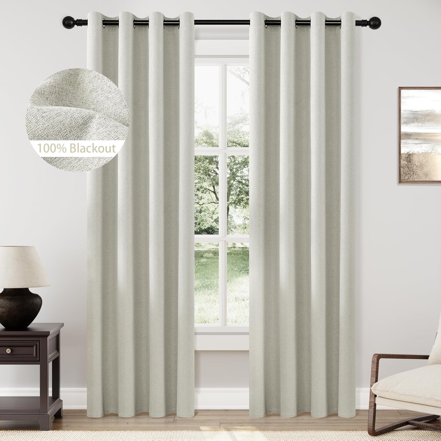 PACKAGE:linen blackout curtain 2 panels per package. Each window treatment drapes measures 52 inch wide by 84 inch long with 8 silver metal grommets (1.6 inch inner diameter) on top, easy to install and slide.