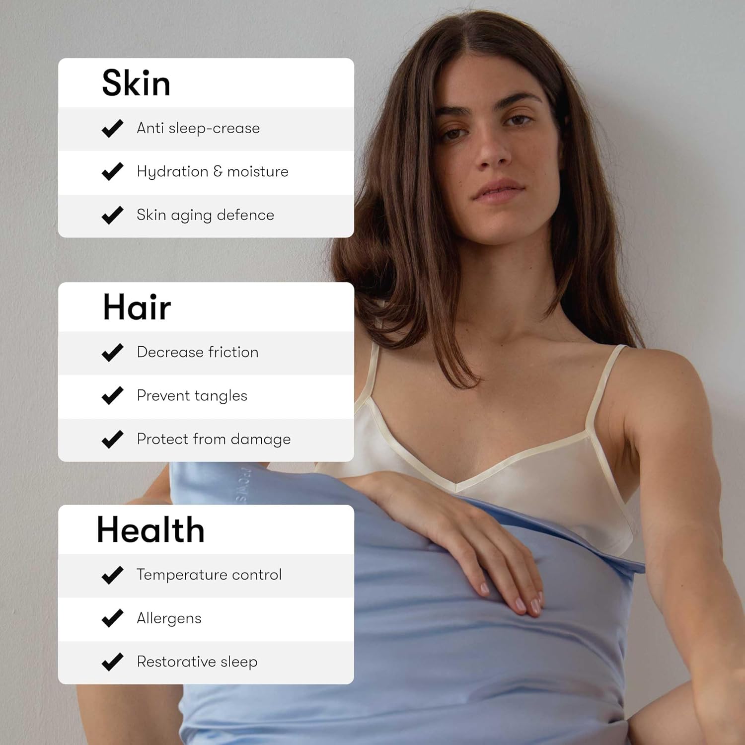 ✔︎ Prevent Hair Breakage and Frizz: silk reduces the friction that causes long term damage to hair and skin at night. Naturally hypoallergenic, making it an excellent choice for those with sensitive skin or allergies.