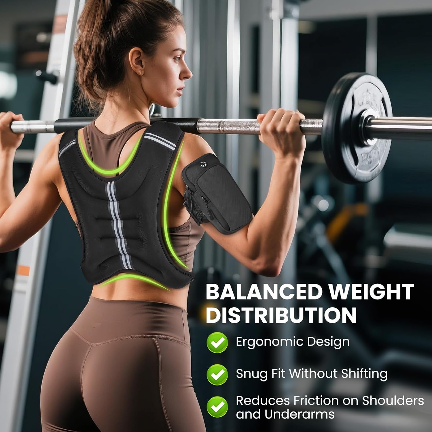 【Weighted Vest with Removable Storage Pocket】Crafted from skin-friendly, breathable air mesh and stretch-resistant polyester fabric, it’s water-resistant, sweatproof, and washable. Spacious enough for phones with screens up to 6.5 inches. The adjustable armband’s range fits arm circumferences up to 12 inches.