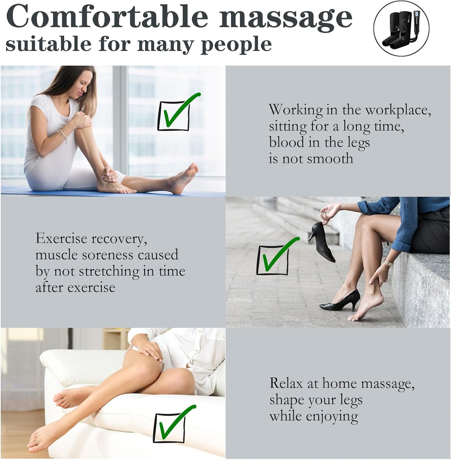 Foot and Leg Air Compression Massager:The BEST GIFT leg and foot massager for circulation uses a all-around airbag design inside, giving a comfortable massage experience from foot to leg. Leg massager for circulation air compression, foot massager for pain and circulation, foot and leg massager for circulation and relaxation. Helps relieve fatigue, pain and promote blood circulation