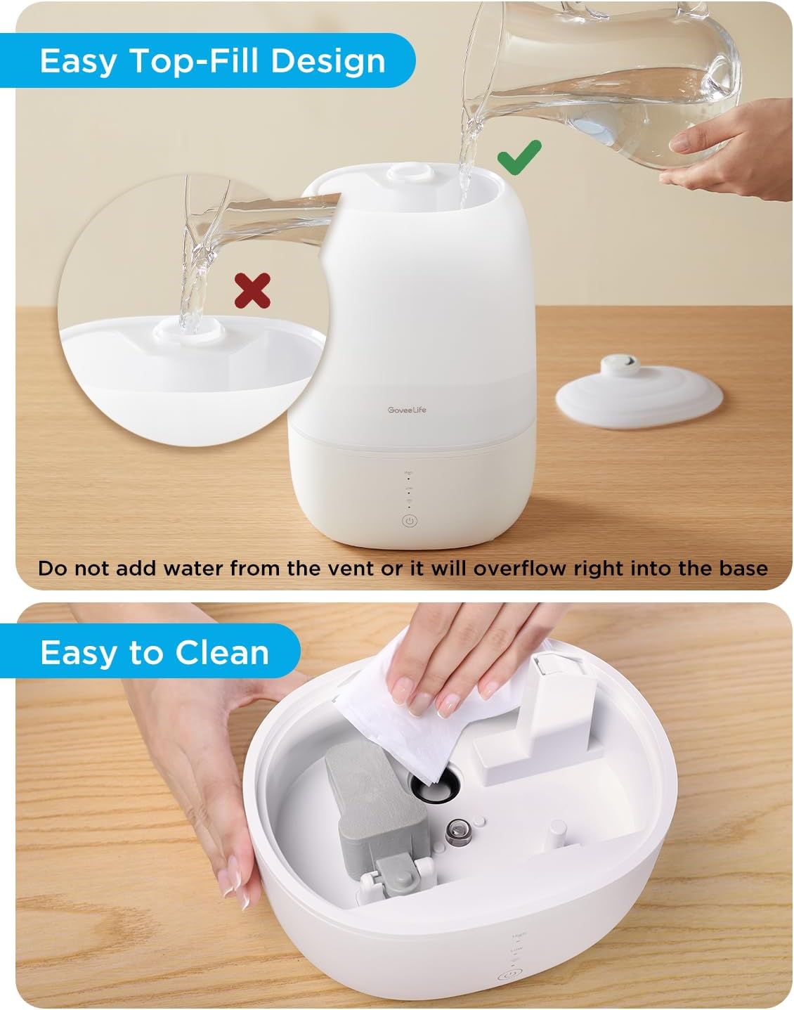 Easy Top-Fill Design: You can easily lift the lid to add more water, no need to turn over the water tank. The simple construction design allows for quick disassembly and cleaning, ensuring you can enjoy fresh mist.(we recommend using purified or distilled water)