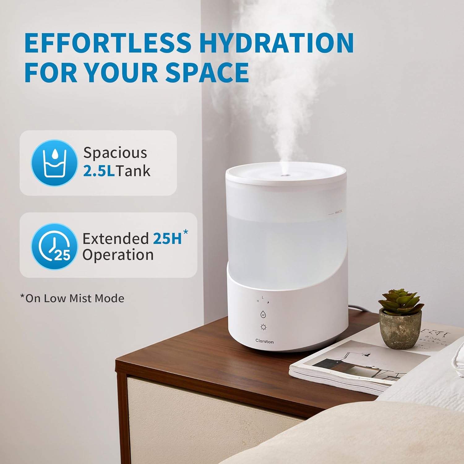 Long-Lasting Hydration & Automatic Shut-Off: Equipped with a 2.5L large tank, this humidifier delivers up to 25 hours of continuous, soothing mist, helping to ease you into a restful sleep while alleviating congestion and dry throat; the automatic shut-off feature ensures safety and peace of mind, turning the device off when water levels are low