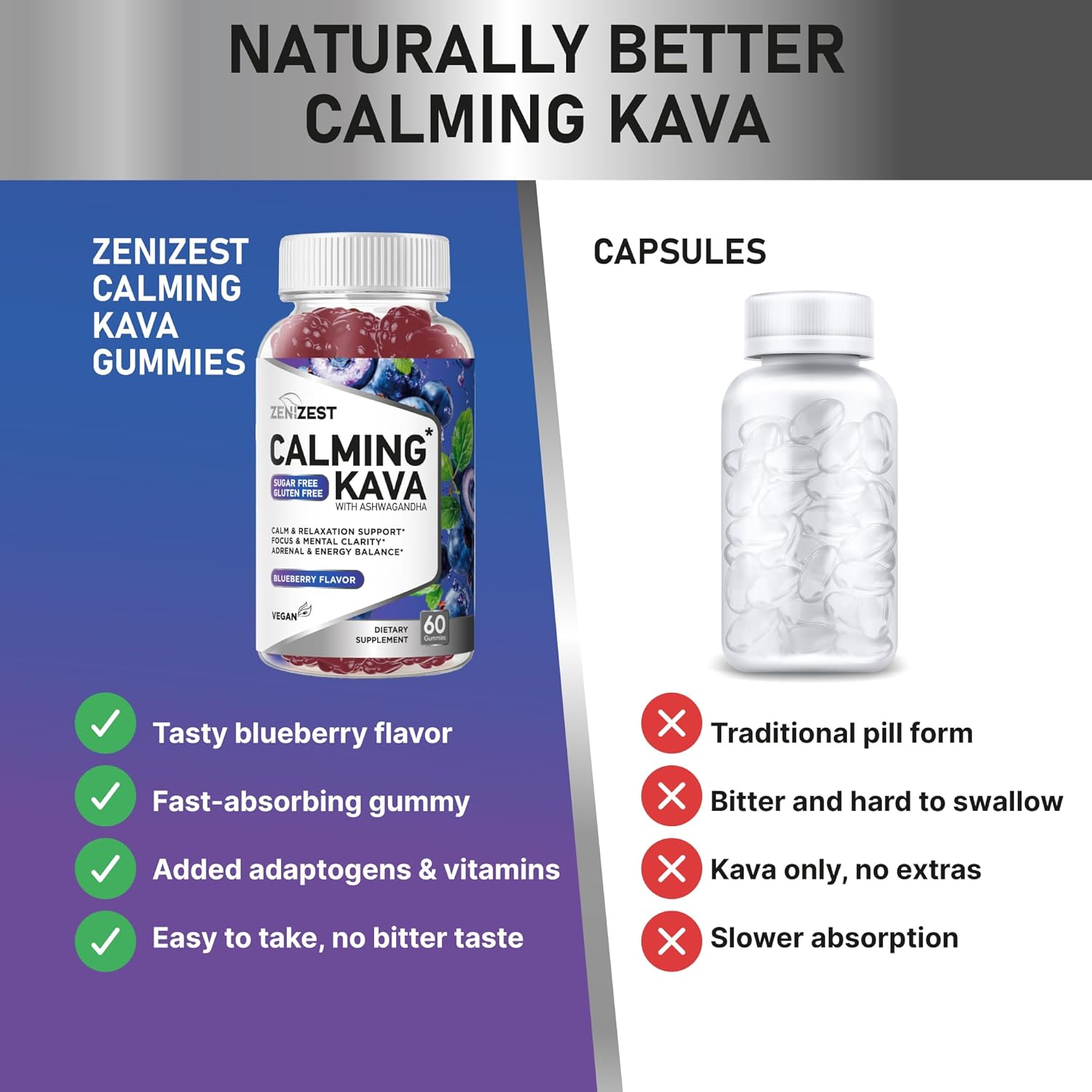 Delicious Blueberry Gummies for Daily Use: ZeniZest Calming Kava delivers natural calming benefits in tasty blueberry flavor candy gummies with no added sugar. With 60 gummies per bottle, it’s easy to stay consistent with wellness routines at home, work, or on the go By taking two gummies a day, you can promote a balanced, relaxed, and focused lifestyle, support restful sleep, and make self-care both simple and enjoyable.