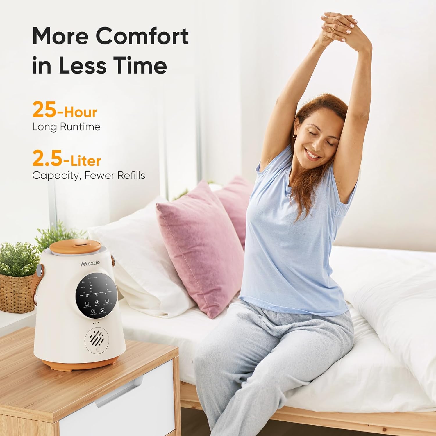 High and Efficient Humidification: The Maxico small humidifier produces mist up to 28 inches high and can run for up to 25 hours on low, thanks to its 2.5-liter capacity. It quickly boosts indoor humidity, relieving congestion, dry throat, and dry skin