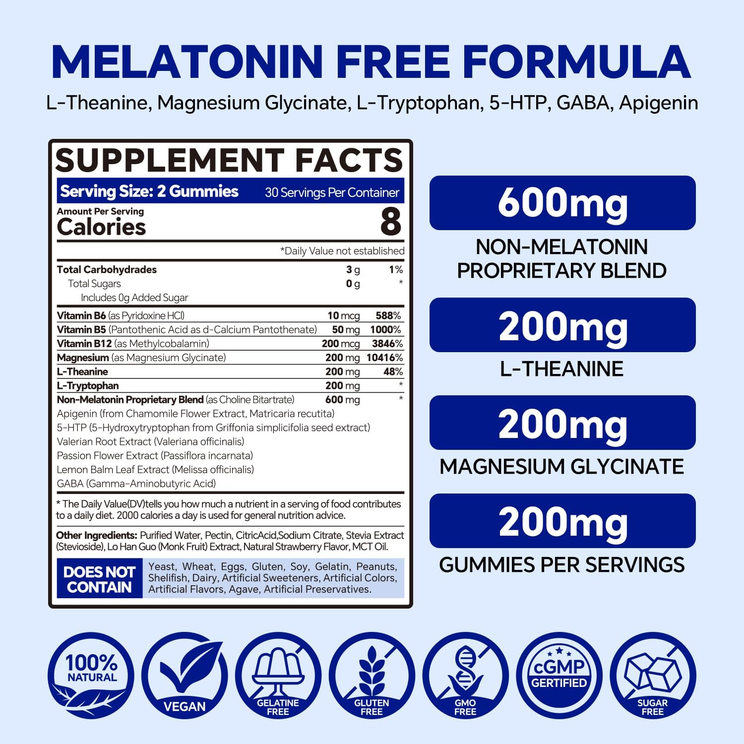 🌛Vegan & Pure: Pure goodness in every bite.With active ingredients derived from all-natural plants, our melatonin free gummies are a natural way to improve your rest while regulating your mo💗d.100% organic, non-GMO, soy-free, gluten-free, gelatin-free, lactose-free, vegan, no artificial flavors, no artificial preservatives. Please contact us with any questions about the product.