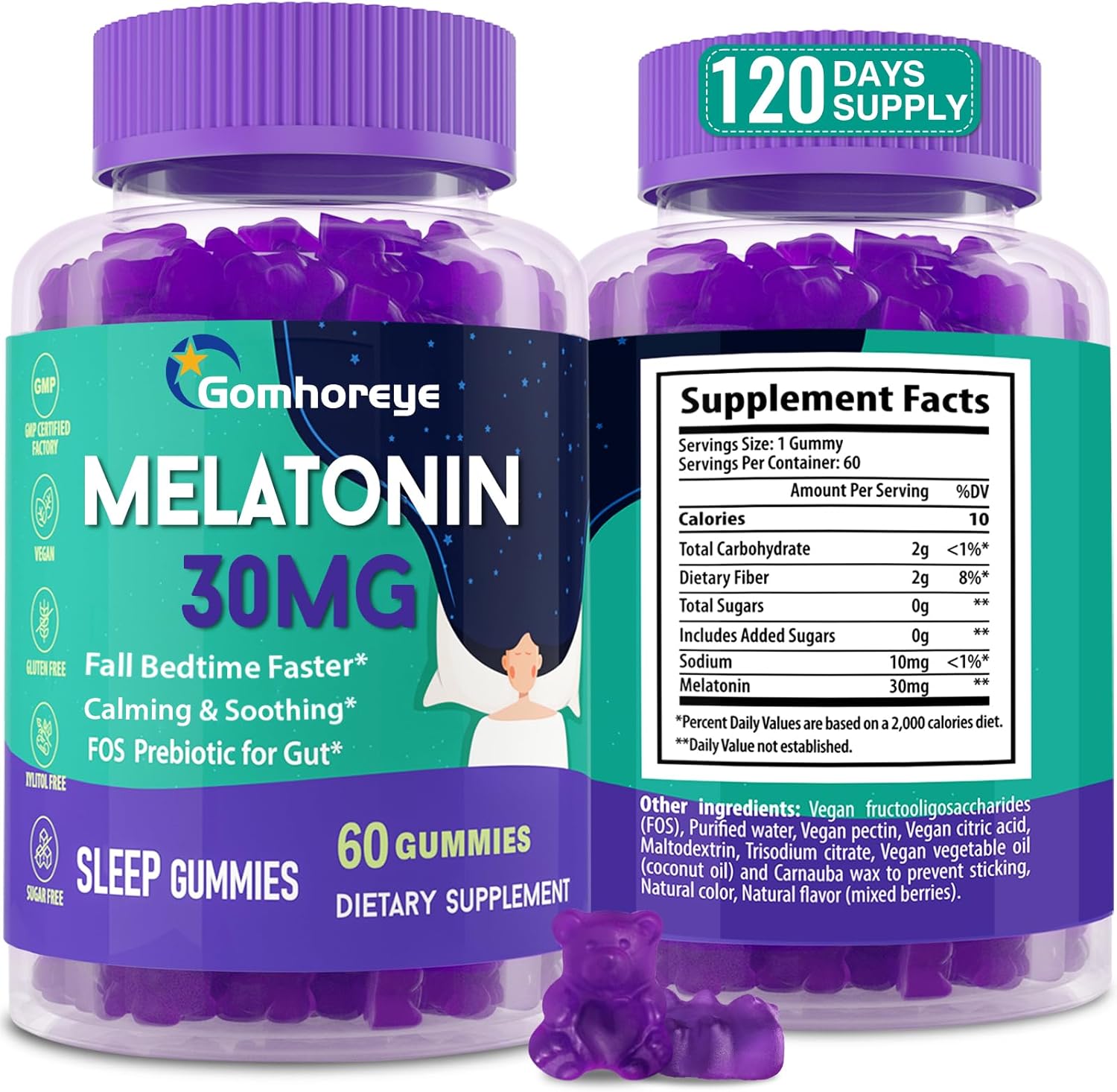 NATURAL INGREDIENTS: Melatonin gummies are packed full of natural ingredients and contains No GMOs, No Gluten, No Soy, No Dairy, No Artificial Colors or Preservatives and is 100% Vegetarian, Sugar-Free. Each bottle now comes with 60 melatonin gummies and this is a full 120 servings or a 4 month supply