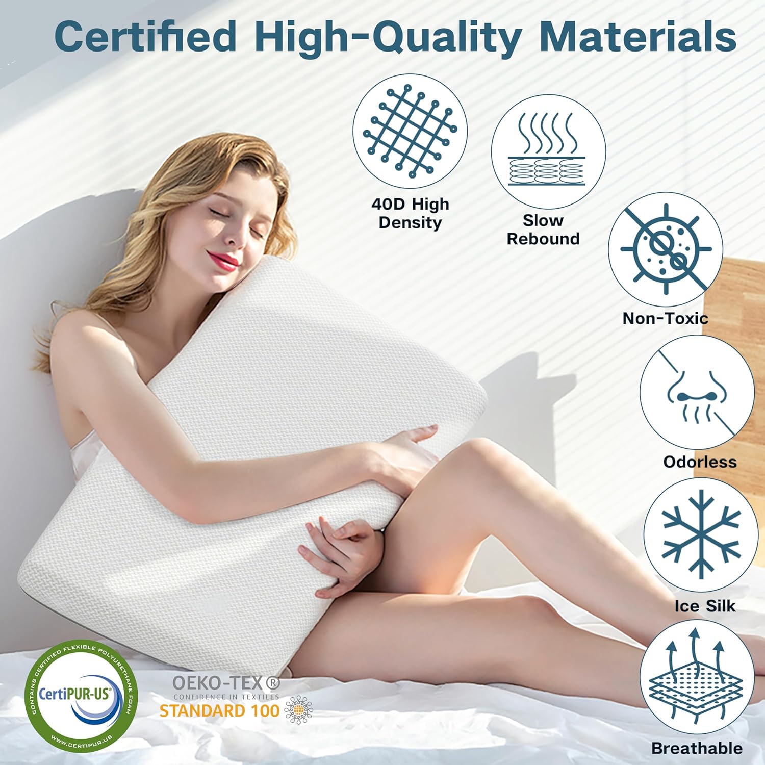 Certified Safety Pillow: The memory foam of the queen-sized pillow is CertiPUR-US certified and the cover is OEKO-TEX STANDARD 100 certified. Perfect for seniors, massage parlours, supine sleepers, physiotherapists and more. It is an excellent gift choice! Long-term use will greatly improve the quality of sleep.