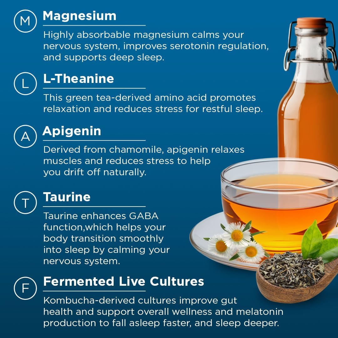 Natural Sleep Supplement – Relax your mind and body. Our gummies combine magnesium, L-theanine, apigenin, taurine, vitamin B6, and kombucha to help ease you into a restful night’s sleep.