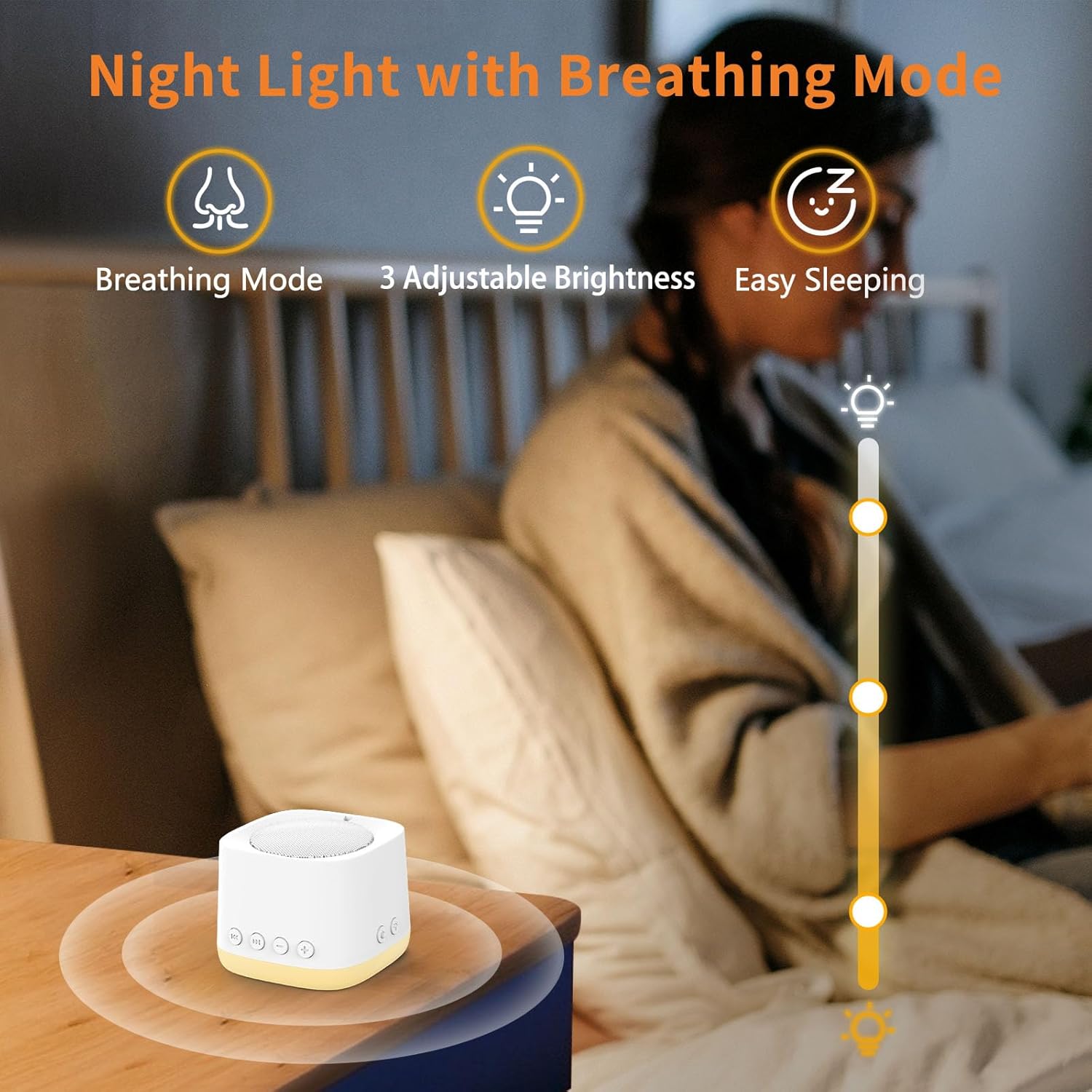 【Ultra portable Sound Machine】This sound machine slips into any pocket or carry-on at only 3.0 oz, yet packs a gentle amber breathing night light. The travel sound machine is perfect Ideal for restless nights in hotels, tents, offices, plane or train cabins—drift off peacefully wherever you roam