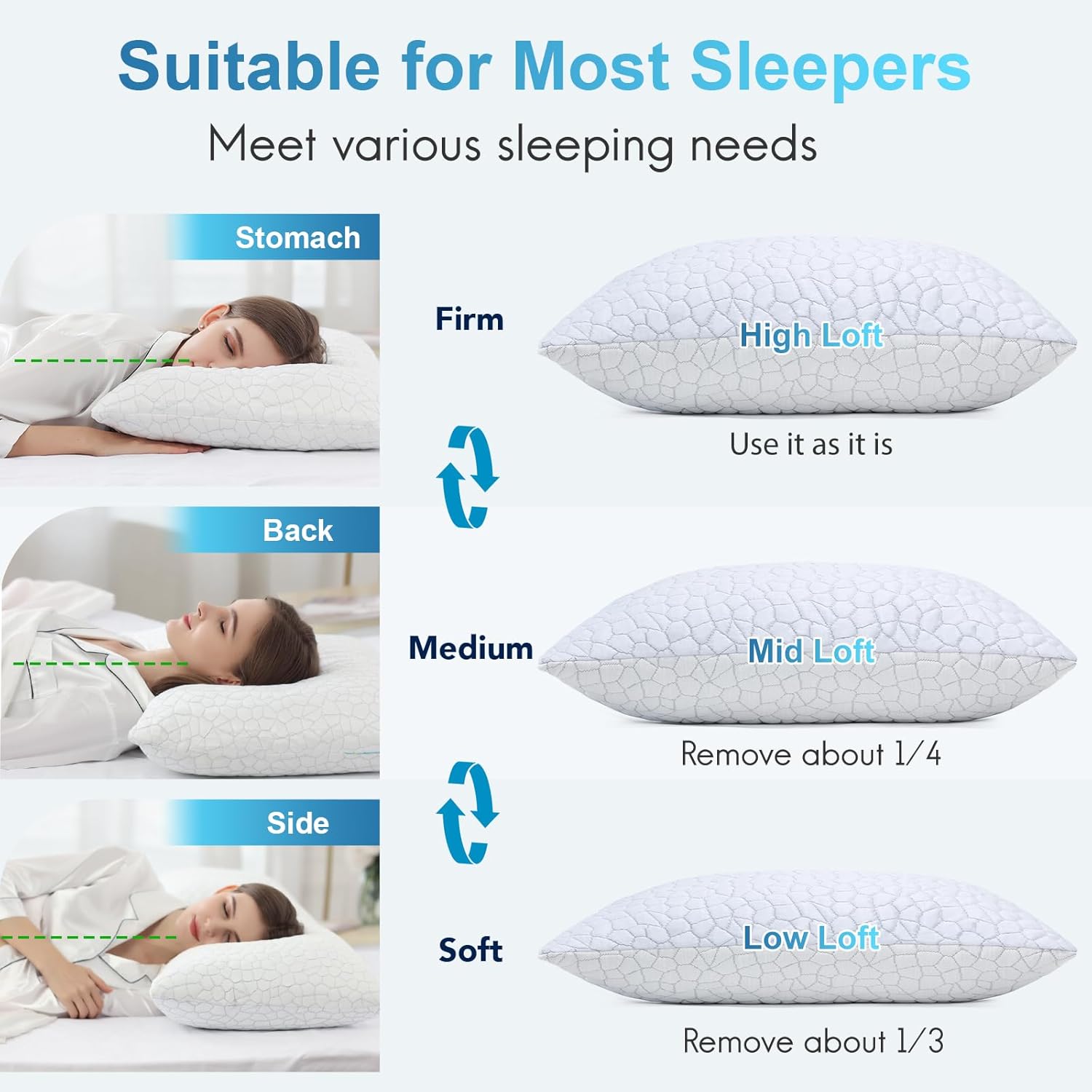 Adjustable Loft and Firmness – QUTOOL adjustable pillow provides hotel-quality softness, and offers firm support. The queen pillows feature a zippered inner and outer cover, you can ADD or REMOVE foam filling to suit your size, shape or sleep position, find the right comfort level and provide you with the ultimate sleeping experience. Suitable for side sleepers, back sleepers and stomach sleepers.