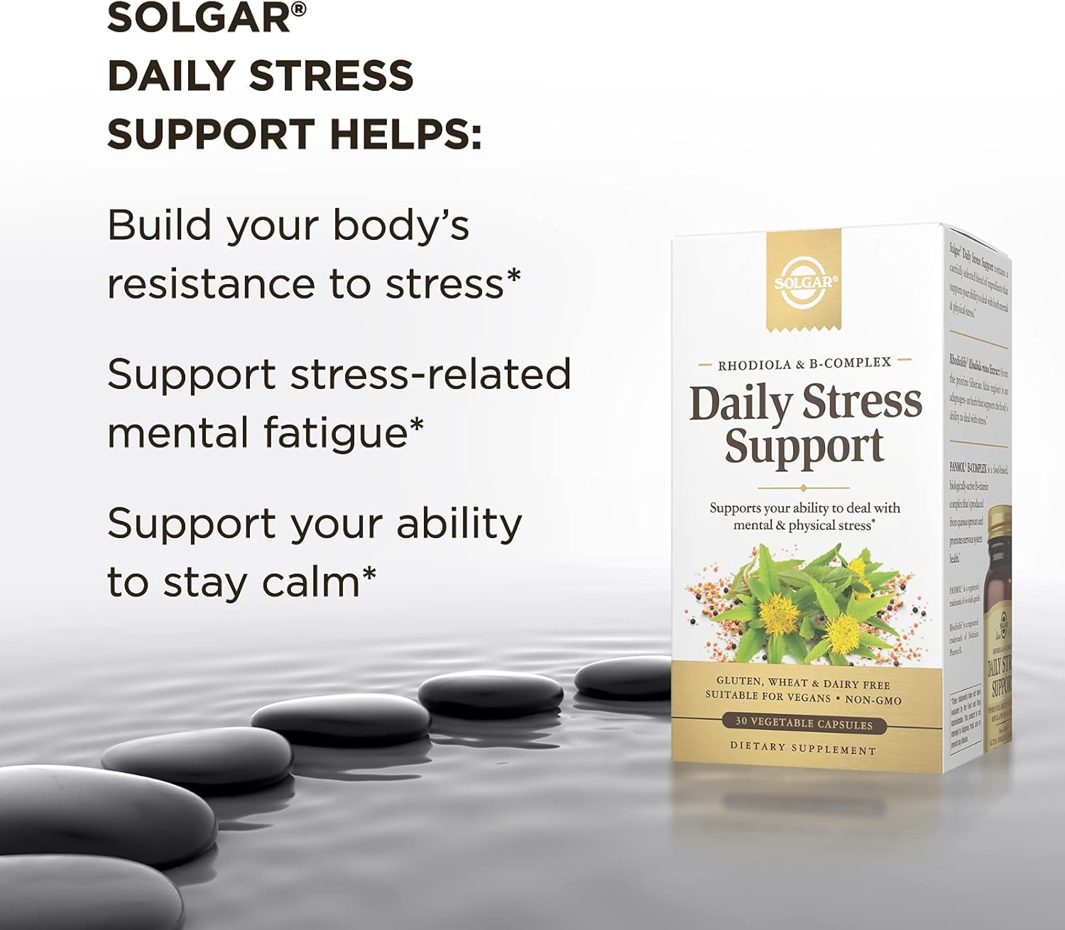 DAILY STRESS SUPPORT Solgar® Daily Stress Support contains a carefully selected blend of ingredients designed to support your ability to deal with both mental & physical stress*: Rhodiolife® Rhodiola and PANMOL® B-COMPLEX. Rhodiolife® Rhodiola rosea extract from the pristine Siberian Altai region is an adaptogen – an herb that supports the body’s ability to deal with stress.* PANMOL® B-COMPLEX is a food-based, biologically-active B-vitamin complex that’s produced from quinoa sprouts and promotes nervous system health.* Solgar® Daily Stress Support helps: Build your body’s resistance to stress* Support stress-related mental fatigue* Support your ability to stay calm* This unique formulation is also 100% drug-free and non-habit forming. Get ahead of stress with Solgar® Daily Stress Support.
