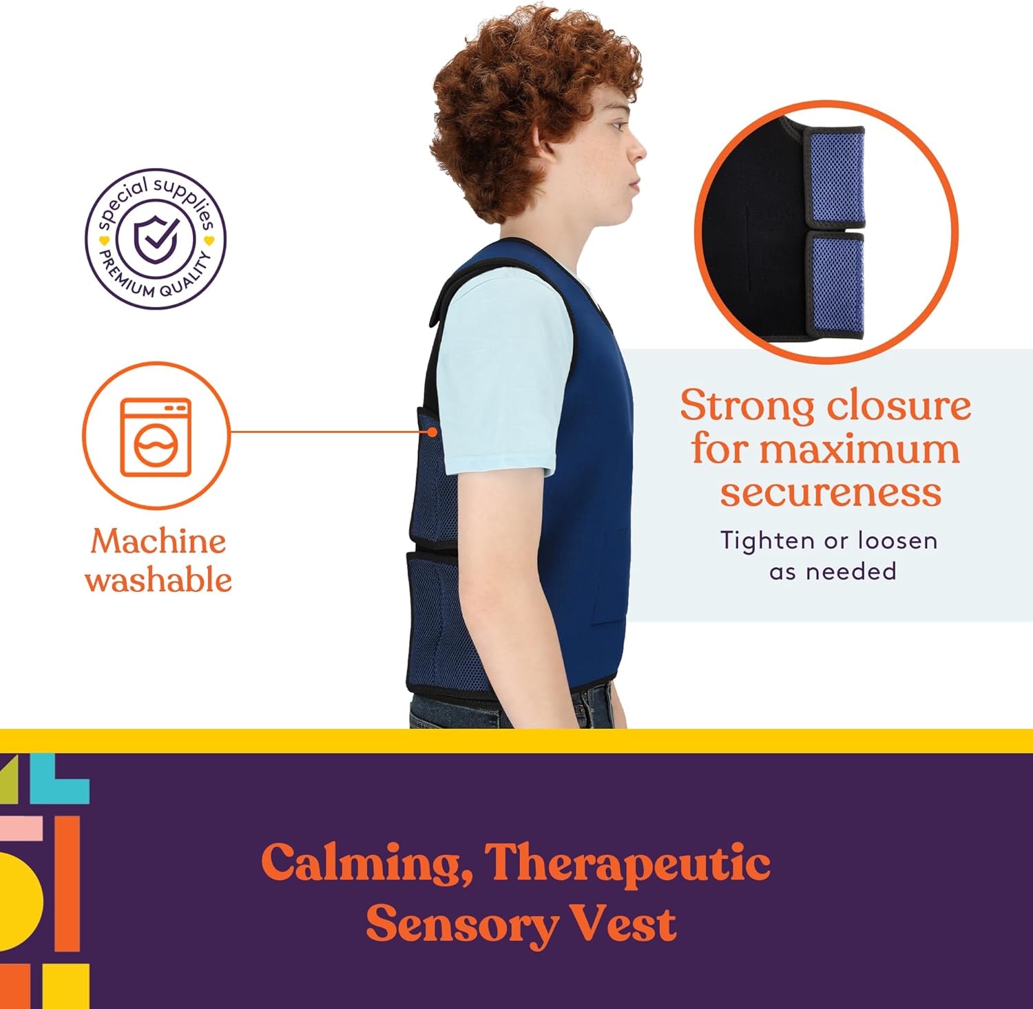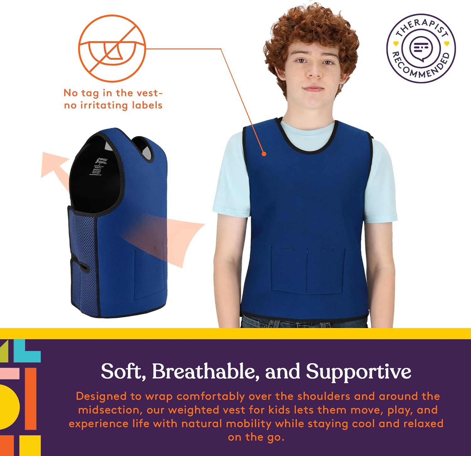 Sensory Weighted Compression Vest for Kids Two (2) Front Pockets with Two (2) ½ lb. Sand Bags Four (4) Back Pockets with Four (4) ¼ lb. Sand Bags Customizable Weight Distribution and Compression Fit Soft, Breathable, and Comfortable for Relaxed Support Fully Adjustable Shoulder and Midsection Straps Available in 4 Comfort-Fit Sizes.
