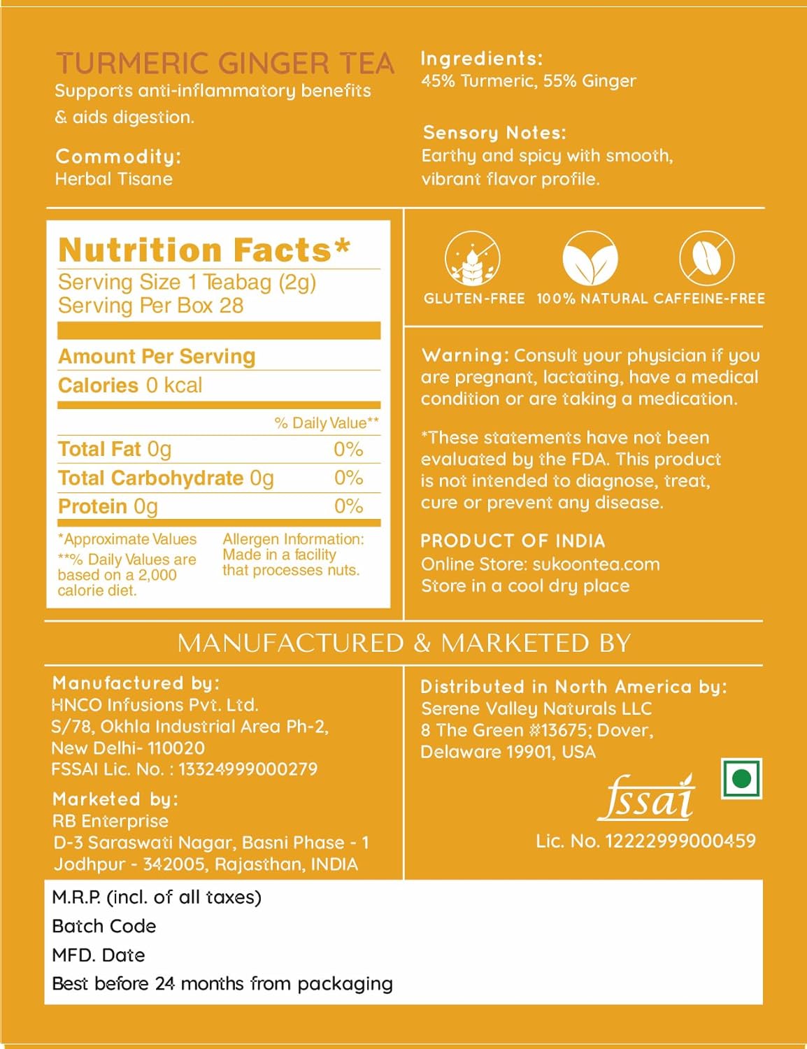 Eco-friendly packaging & himalayan sourcing : Sukoon Organic turmeric and ginger tea is sourced directly from the himalayas and packaged in 50 biodegradable teabags organic. Our sustainable packaging ensures that every tea bag organic preserves the natural integrity of our blend. Designed with care, these tea bags organic deliver consistent quality similar to ginger tea bags organic and lemon ginger tea bags, while our commitment to eco-friendly practices.