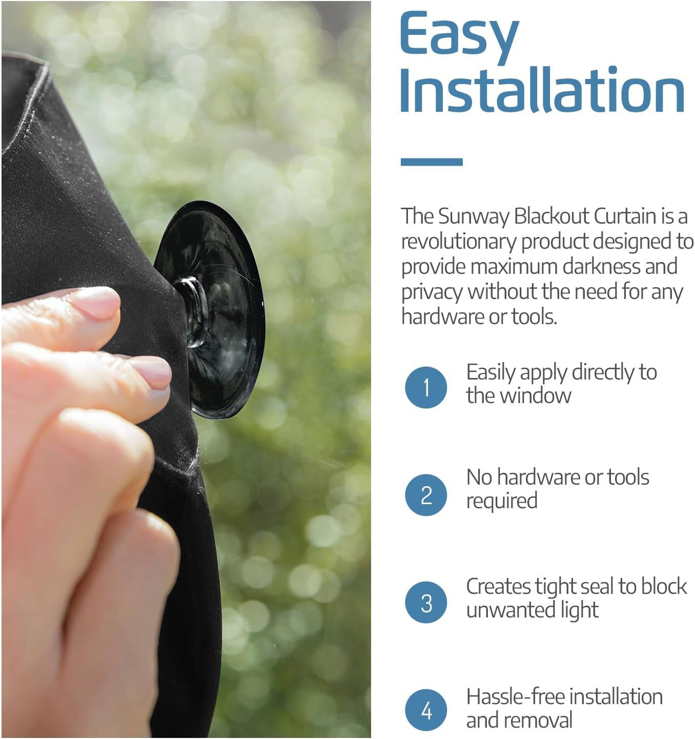 PORTABLE STICK-ON BLACKOUT BLIND – Easily blackout any rooms windows no matter where you are! The SUN AWAY portable blackout curtain features durable suction cups, making it great when traveling or as a temporary window cover — Large size of 66″L x 51”W