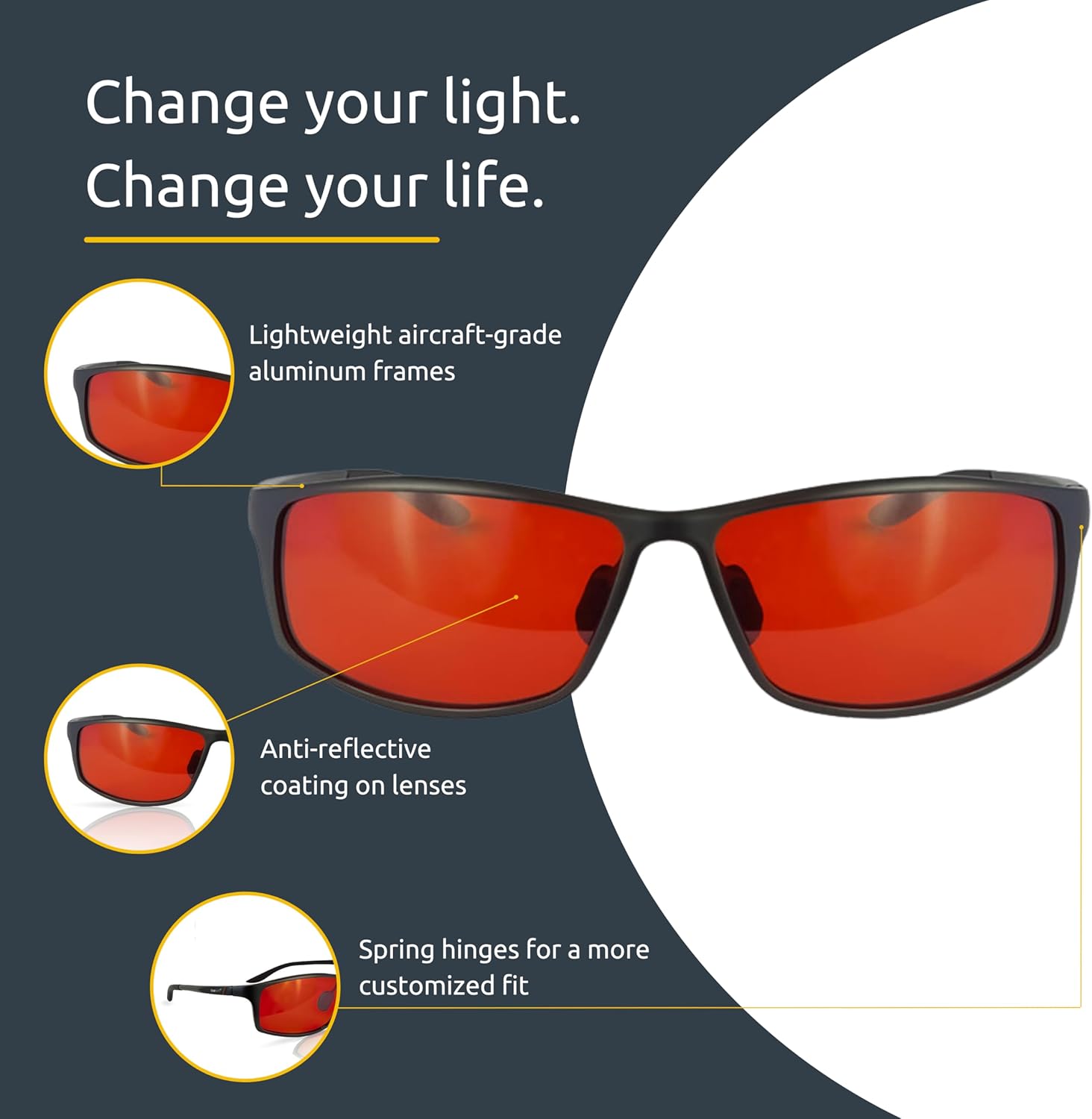 TrueDark Twilights prevent your melanopsin cells from detecting the wrong wavelengths of light at the wrong time of day. In other words, it protects your melanopsin from the entire light spectrum that negatively impacts your biological clock — including blue, green and purple light. Wear TrueDark Twilights for 30+ minutes before going to bed to help your mind and body reach an alpha state and fall asleep with ease.