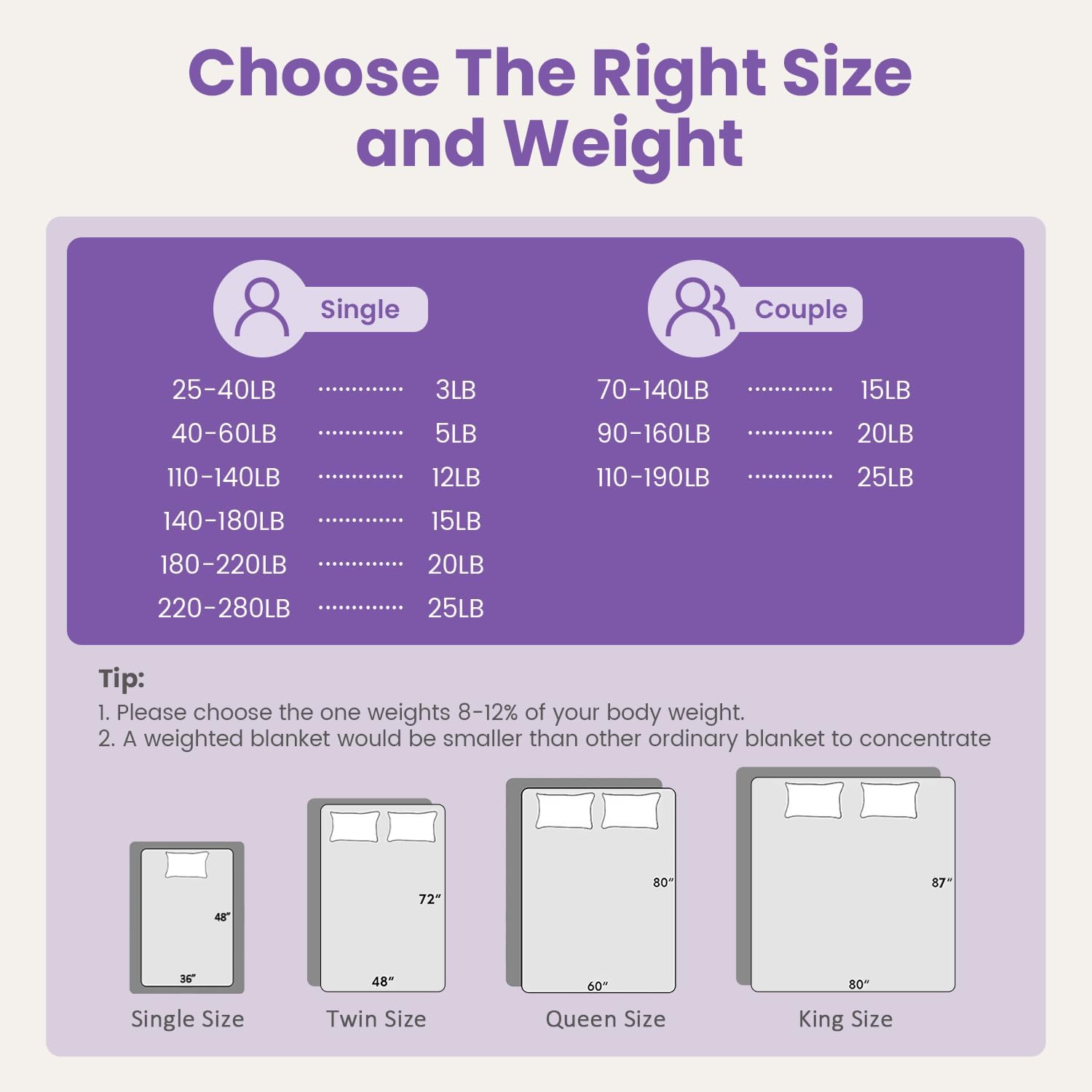 Choosing the Right Weight: We suggest that you start with a blanket which weighs approximately 8%-12% of your body weight. Usually, it takes 3-5 days to adjust to the weight of this blanket. A quick note: a weighted blanket would appear smaller than a traditional one since its weight needs to concentrate on your body, so the blanket doesn’t hang over the edge of the bed
