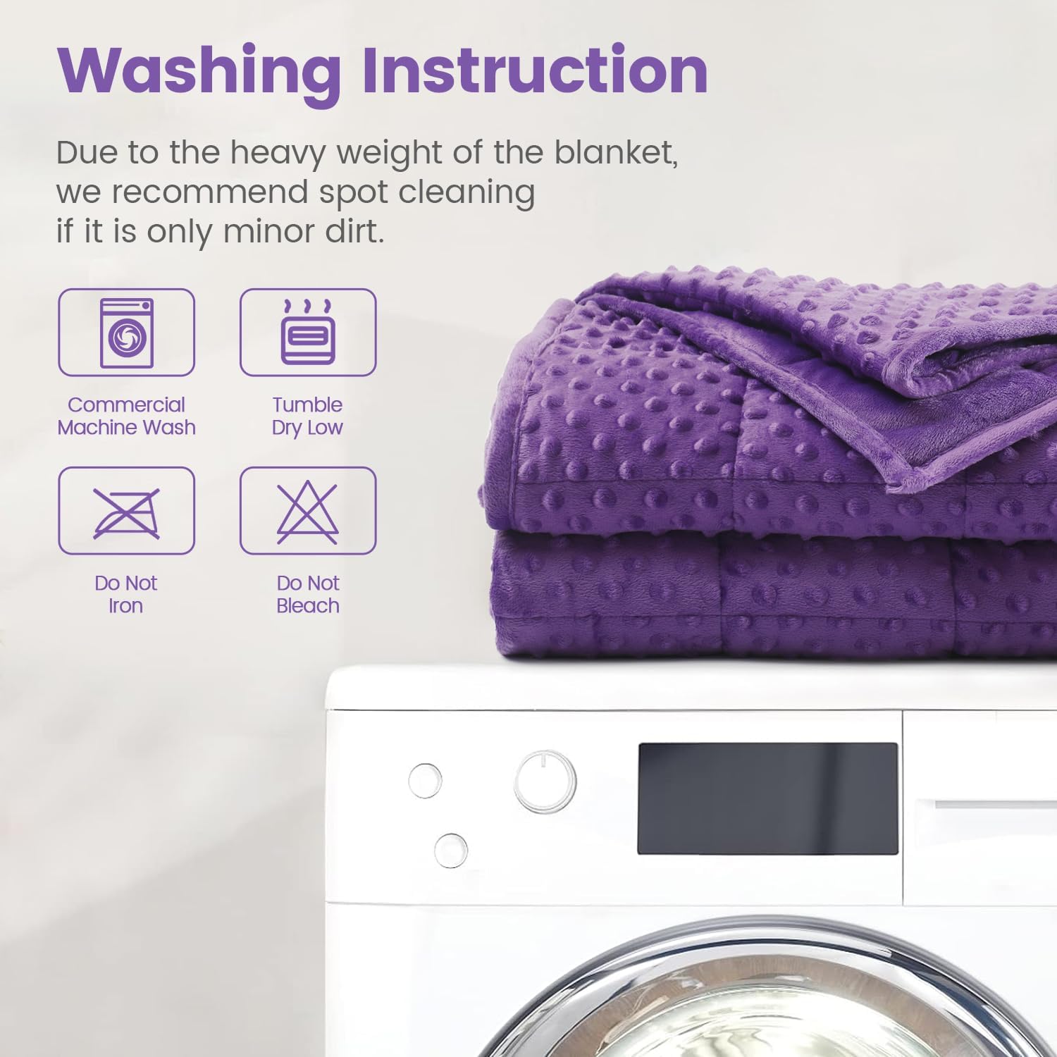 Washing Instruction: Our weighted blankets are designed for durability and wrinkle resistance, no pilling, fading, or shrinking. We recommend washing in a commercial machine and tumble drying on a low temperature, blankets should not be bleached or ironed, if only lightly soiled we recommend spot cleaning