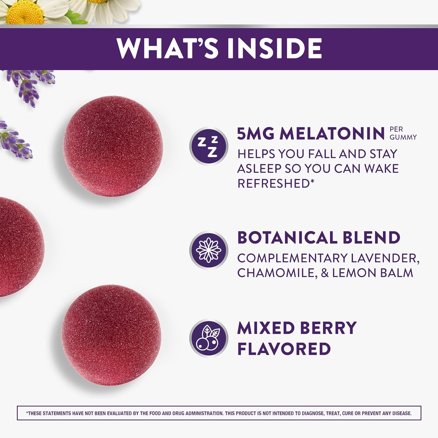 COMPLEMENTARY BOTANICAL BLEND: This 5mg melatonin gummy sleep aid contains a complementary blend that includes botanical extracts of chamomile and lavender
